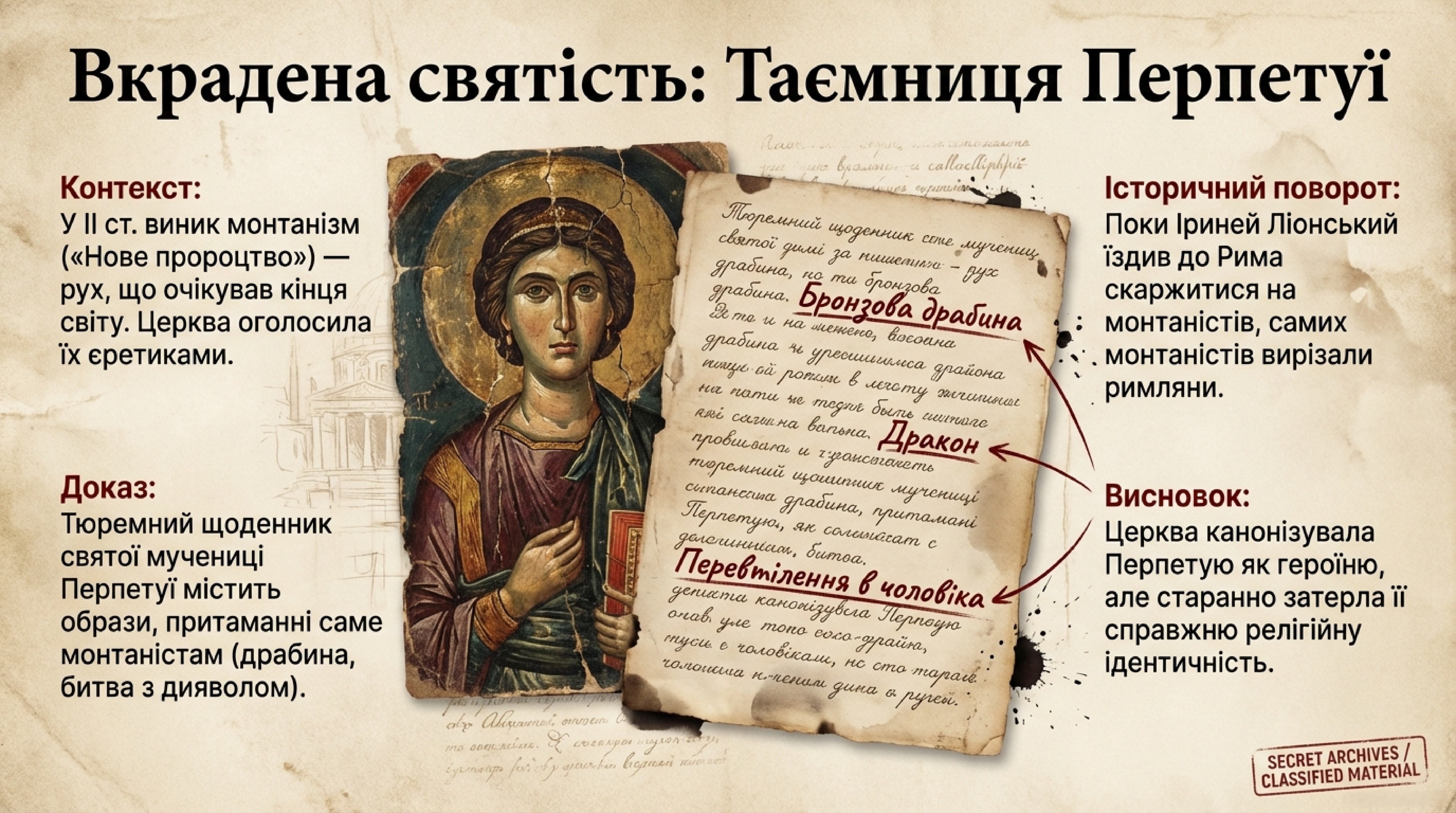 Найпромовистішим прикладом історичних маніпуляцій є життєпис святої Вібії Перпетуї. Вона — одна з найвідоміших ранньохристиянських мучениць, а її тюремний щоденник є безцінною пам’яткою. У ньому Перпетуя відкрито називає свою громаду послідовниками «Нового пророцтва», себто монтаністами. Її нотатки дають змогу збагнути світогляд цих людей: вона описує видіння бронзової драбини, обвішаної зброєю, під якою лежить дракон, на голову якого належить наступити; вона перевтілюється в чоловіка-борця для двобою з єгиптянином (уособленням диявола) і відкидає відчайдушні благання батька зректися віри.
