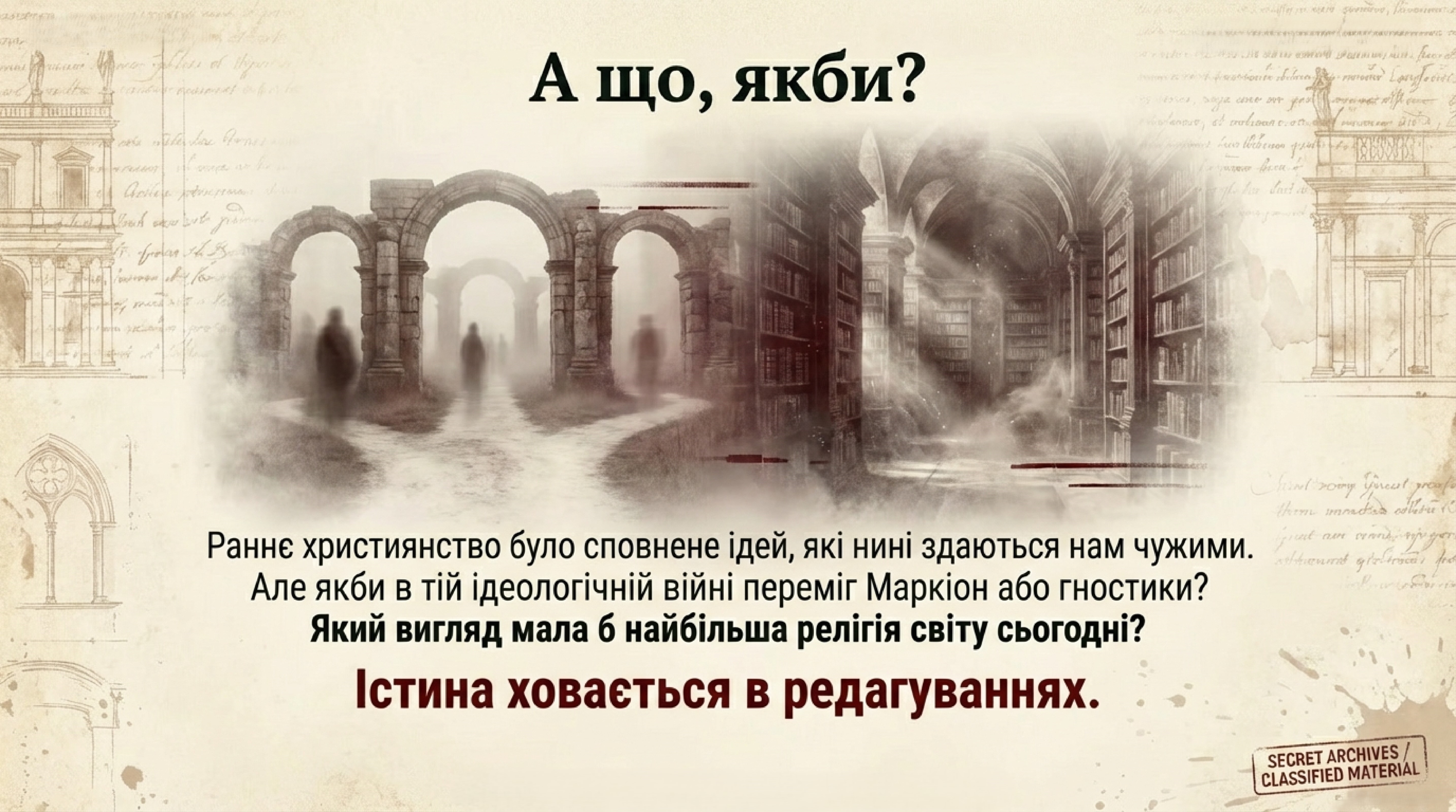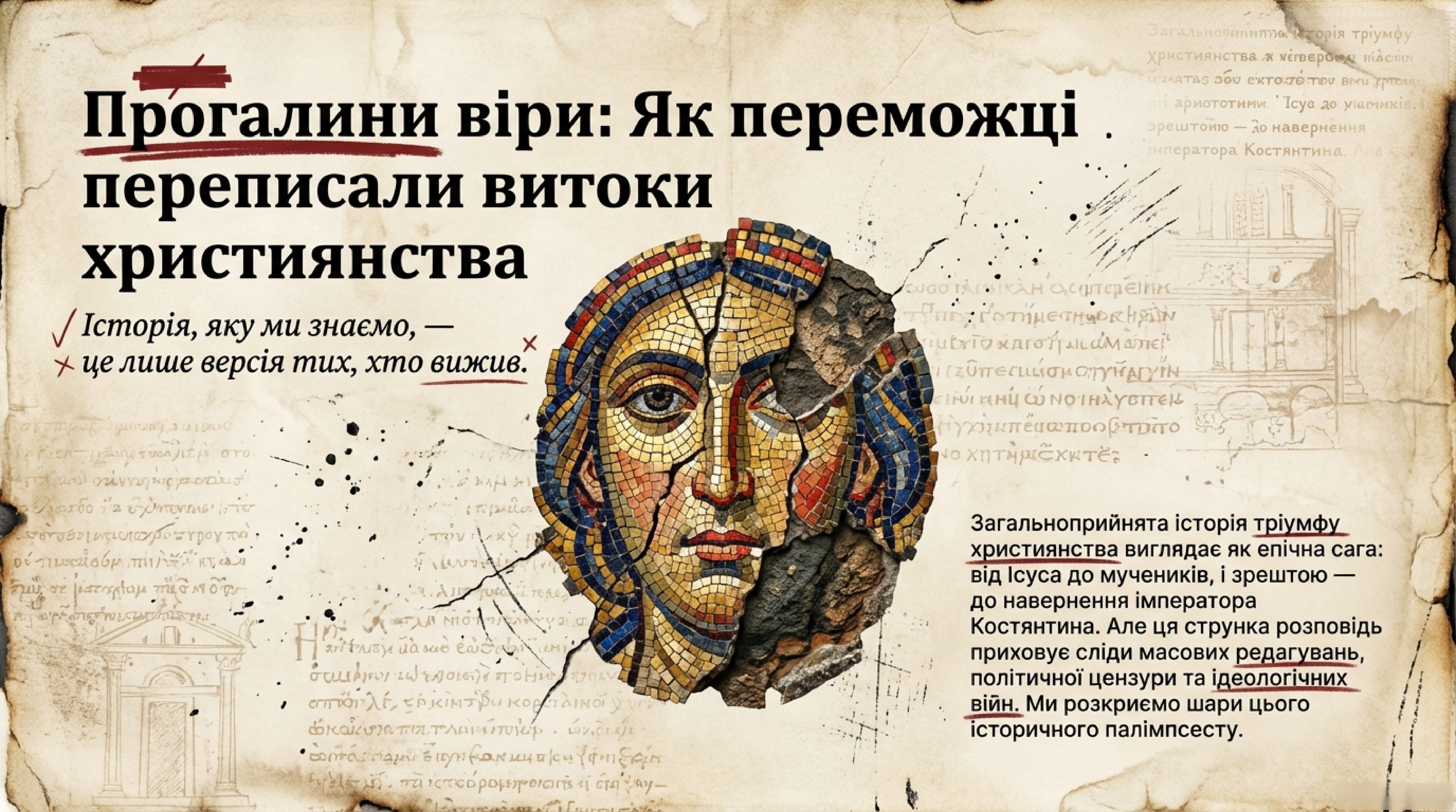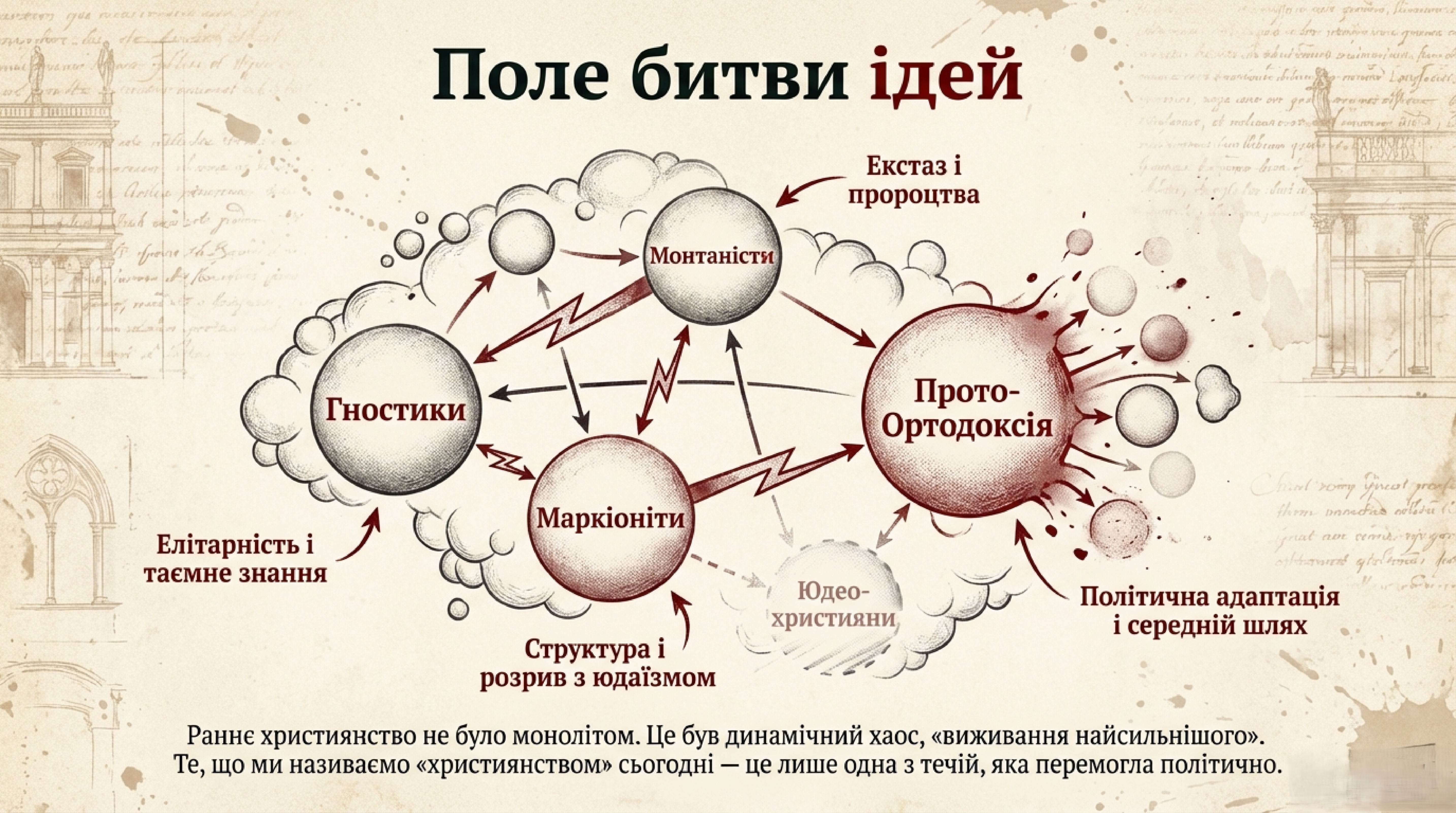 Історія, яку пишуть переможці, завжди видається простою та послідовною. Проте факти свідчать: те, що ми нині знаємо як ортодоксальне християнство, було не єдиною первісною вірою, а лише тією течією, яка вийшла тріумфаторкою із запеклої столітньої ідеологічної та політичної боротьби. Це був пізніший конструкт, який, здобувши владу, заповзято заповнив лакуни минулого, затираючи власні складні та «єретичні» витоки й тавруючи всіх опонентів як слуг диявола.
