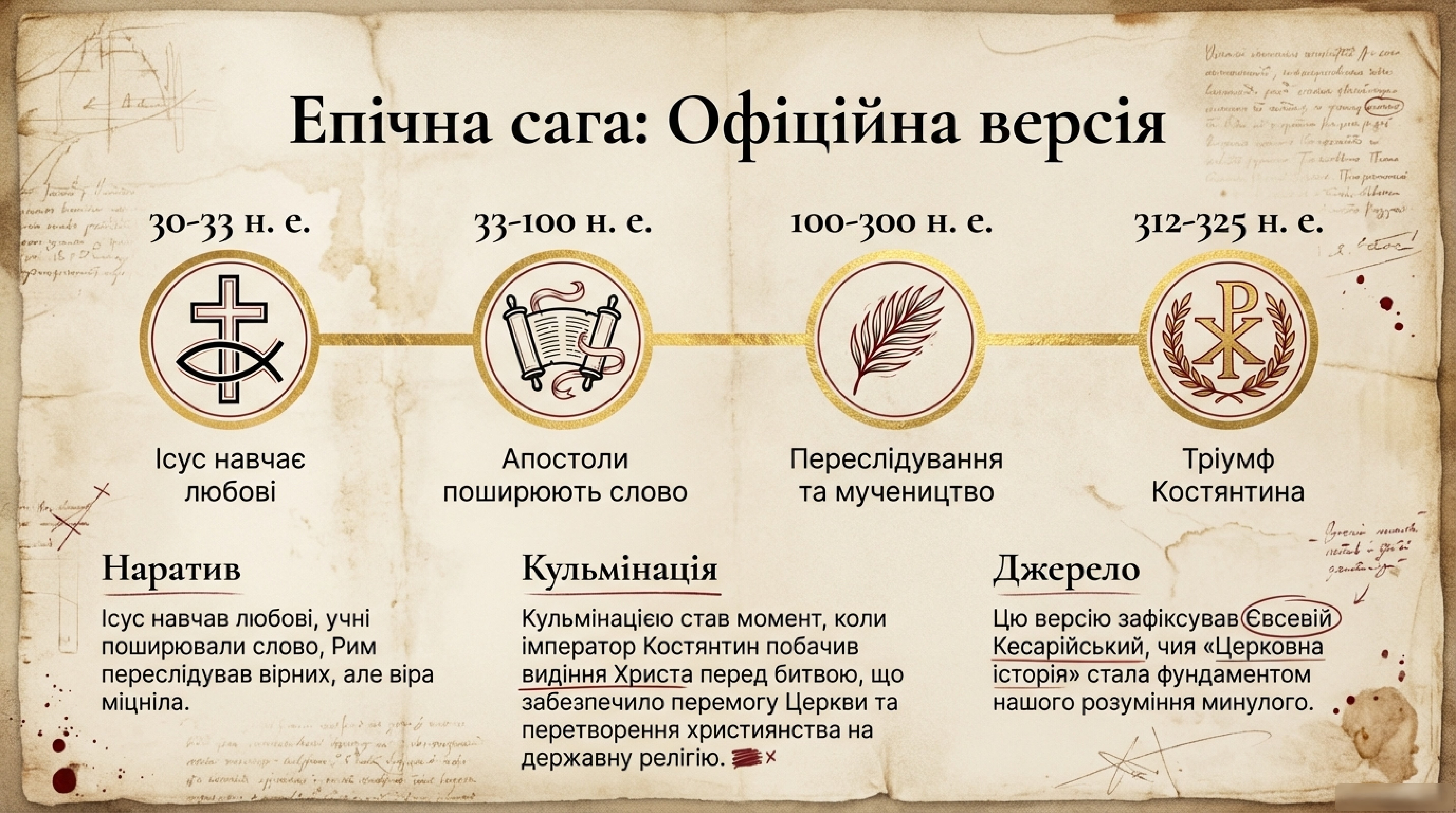 Загальноприйнята історія тріумфу християнства постає як епічна сага. Ісус навчав любові та миру, був розп'ятий, його учнів жорстоко переслідували римляни, проте їхня віра лише міцніла. Зрештою сам імператор Костянтин навернувся до віри, побачивши видіння Христа перед вирішальною битвою, чим і забезпечив остаточну перемогу Церкви.