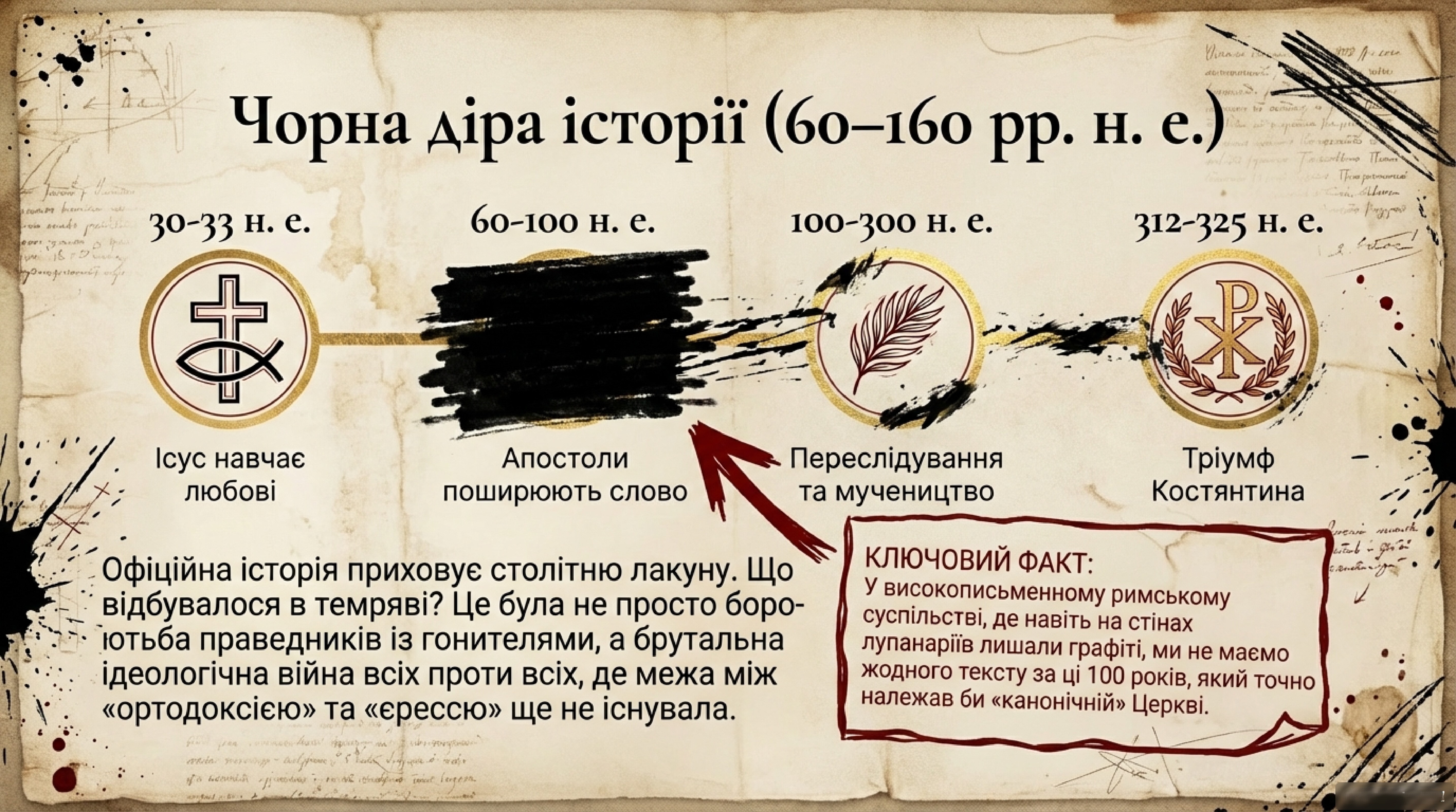 Цю офіційну версію задокументував для нас Євсевій Кесарійський, чия «Церковна історія» на століття стала підвалиною нашого розуміння тогочасних подій. Проте цей цілісний виклад приховує величезну історичну «чорну діру» — майже столітню лакуну, що охоплює період приблизно від 60-го до 160-го року нашої ери. У ту добу — за умов високої письменності римського суспільства, де навіть відвідувачі лупанаріїв залишали графіті на стінах, — ми не маємо жодного тексту, про який можна було б із певністю стверджувати, що його написав представник тієї Церкви, яку сьогодні вважають канонічною.