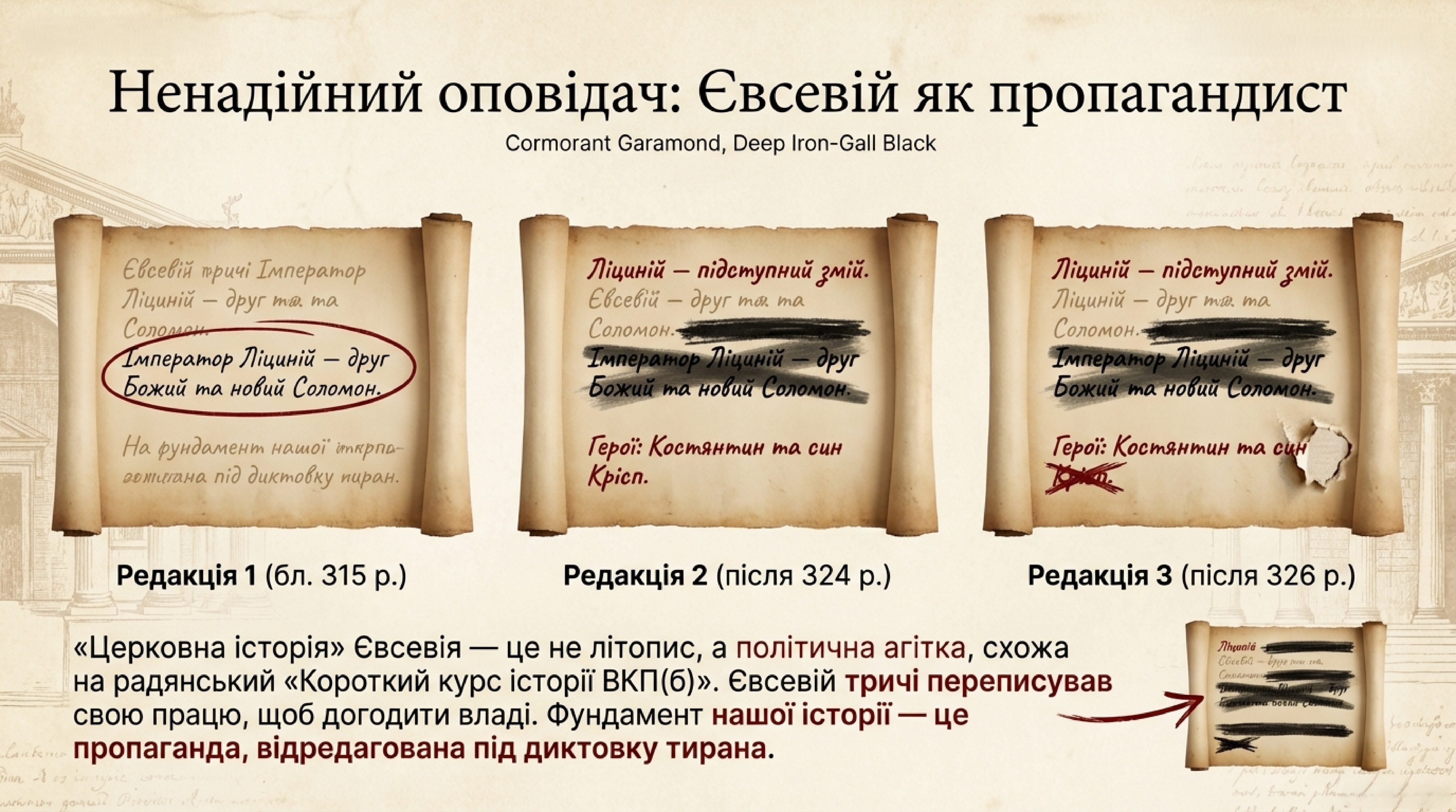 Фундаментальна праця Євсевія Кесарійського, на яку взорується вся традиційна історіографія ранньої Церкви, є вкрай ненадійним джерелом. Насправді це не так історична хроніка, як політична пропаганда, що нагадує радянський «Короткий курс історії ВКП(б)» — офіційну, ретельно відредаговану версію життєпису партії більшовиків. Євсевій був не об'єктивним літописцем, а хистким придворним ідеологом, який майстерно пристосовував свої праці до політичної кон'юнктури. Трагізм ситуації полягає в тому, що для висвітлення багатьох тогочасних подій він залишається нашим єдиним джерелом.