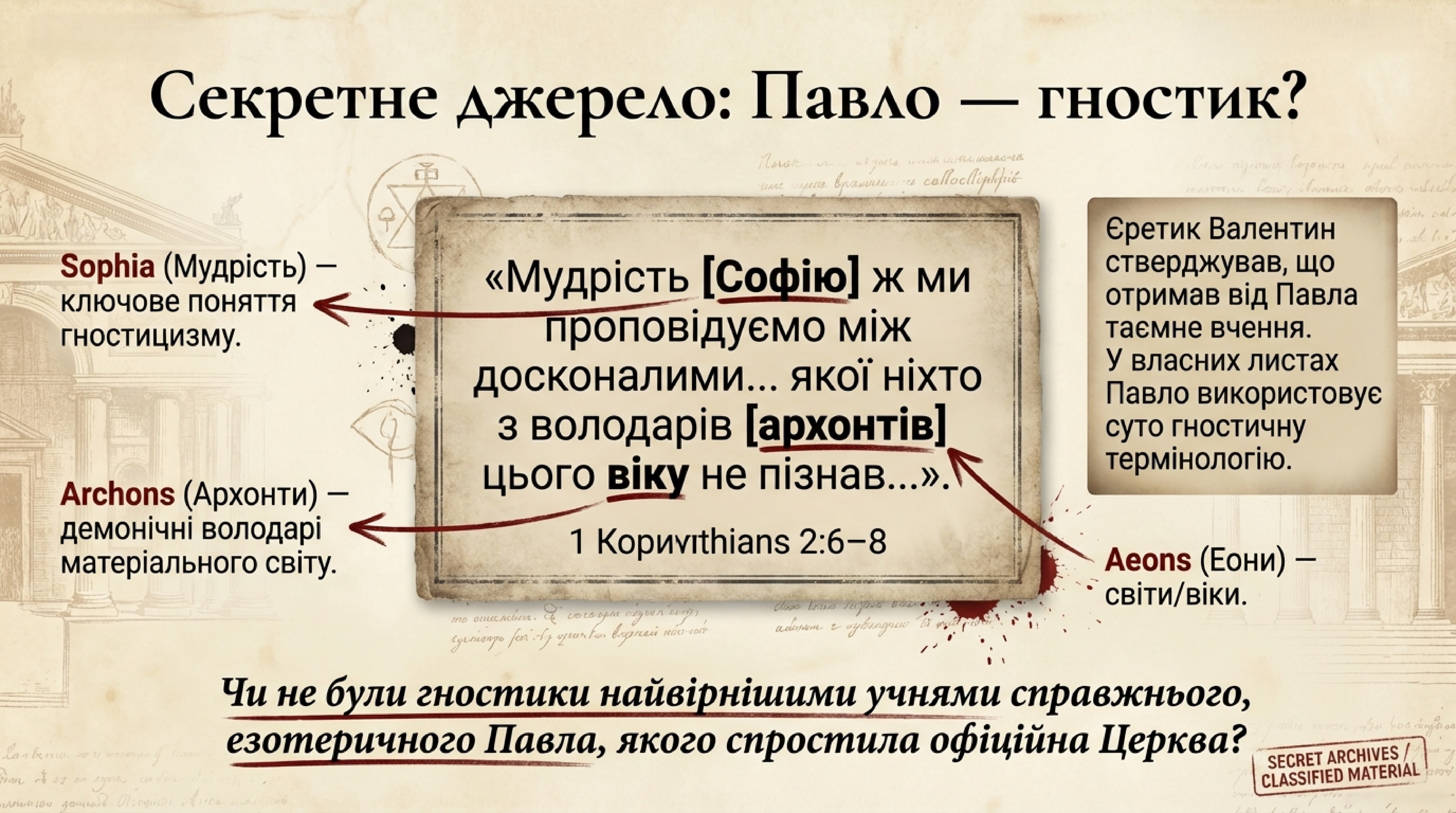 Павло оперує засадничими гностичними термінами: «Софією» (Мудрістю), «еонами» (божественними еманаціями) та «архонтами» (нижчими духовними владцями, що створили матеріальний світ). Він відкрито заявляє, що для «досконалих» (пневматиків) існує таємне вчення, яке різниться від загальнодоступної проповіді для психіків. Це ставить фундаментальне питання: чи не були «єретики»-гностики, зокрема й Валентин, найвірнішими послідовниками справжнього, езотеричного вчення апостола Павла?