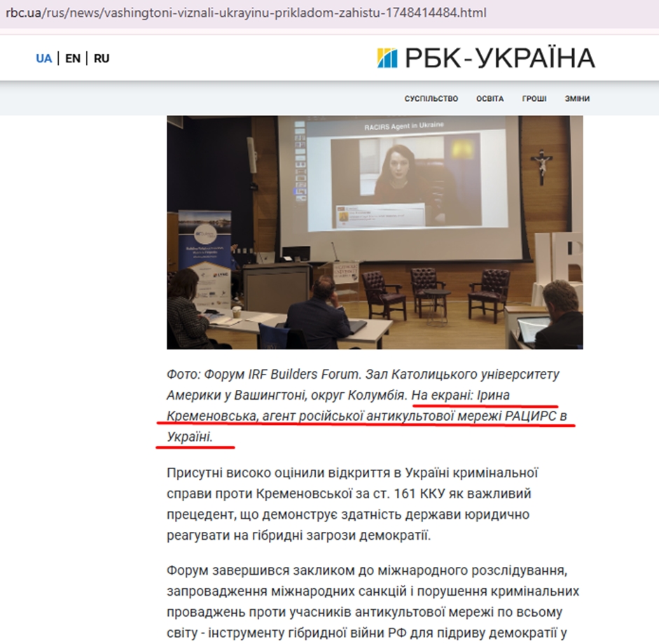 2024 року у Вашингтоні було представлено звіт про методи російської дезінформації. Його було підготовлено за участю американських та міжнародних експертів, а також представників Служби безпеки України та Офісу Генерального прокурора України. Цей документ прямо називає агентку мере́жі російського інформаційного впливу в Україні, яка організувала кампанії дезінформації та кримінальне переслідування “АЛЛАТРА”. У звіті громадянку України Ірину Кременовську названо агенткою російського впливу. Крім нашої організації, вона намагалася дискредитувати українських релігієзнавців, які захищали духовну незалежність України від москви, і лобіювала проросійські норми в українському законодавстві.