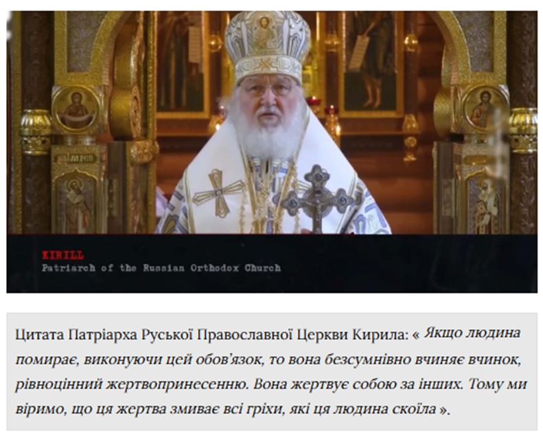 Цитата Патріарха Руської Православної Церкви Кирила: « Якщо людина помирає, виконуючи цей обов’язок, то вона безсумнівно вчиняє вчинок, рівноцінний жертвопринесенню. Вона жертвує собою за інших. Тому ми віримо, що ця жертва змиває всі гріхи, які ця людина скоїла ».