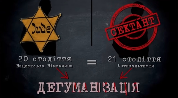 А ви знаєте, що подібні методи ідеологічної обробки та дегуманізації, спрямовані на підготовку суспільства до переслідування та геноциду, активно використовувались якраз у фашистській Німеччині. Використання образів недолюдей, бур'янів чи паразитів, нацистська пропаганда систематично зображала переслідувані групи людей як щось чуже нижче і шкідливе, що потрібно усунути. Це методи антикультистів. Приклади із Другої світової: