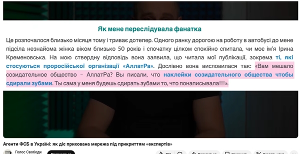 Жіночка, мабуть, впізнала в ній агента фсб, і у неї виникли логічні питання. За словами Кременовської, вона дослівно висловилася так: "Вам мешало созидательное общество? АЛЛАТРА? Вы писали, про наклейки созидательного общества, чтобы сдирали зубами. Ты сама у меня будешь сдирать зубами то, что понаписывала”.