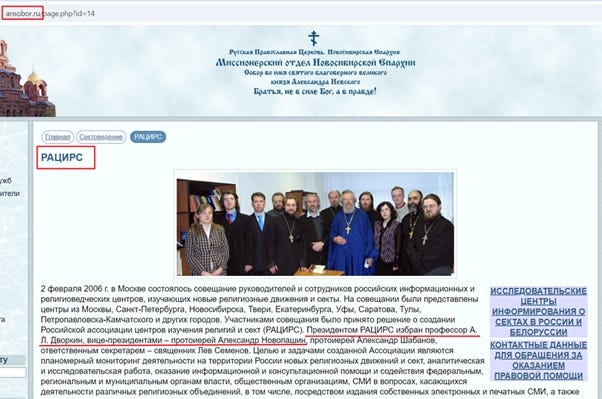скрин «Про РАЦИРС, його членів та діяльність» на сайті підрозділу РАЦИРС — Місіонерського відділу Новосибірської єпархії.