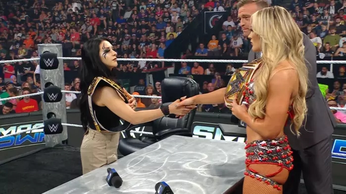 Нік Алдіс перебуває на рингу, щоб провести офіційне підписання контракту за жіноче чемпіонство Crown Jewel. Спочатку він запрошує Тіффані Стреттон. Потім виходить Стефані Впкер. Стефані не сідає, і Тіффані також підводиться.