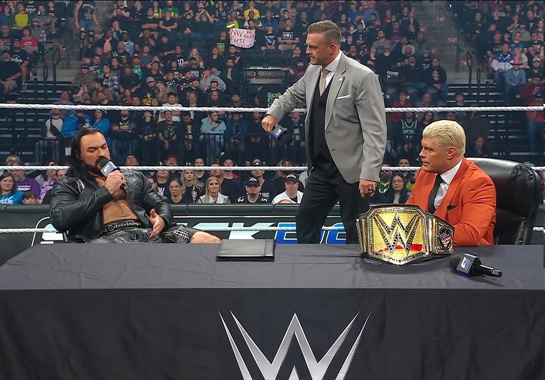Алдіс намагається заспокоїти Коді, але Дрю повертається і раптово проводить Клеймор/ Макінтайр бере титул, кладе його на стілець, хапає Коді й з силою проводить йому павербом через стіл. Дрю й Алдіс стоять обличчям до обличчя, і Дрю сміється. Він піднімає чемпіонський пояс, дивиться на Коді й каже, що стане новим чемпіоном. Потім він вручає титул Коді й піднімає руки вгору. На цьому моменті SmackDown виходить з ефіру.