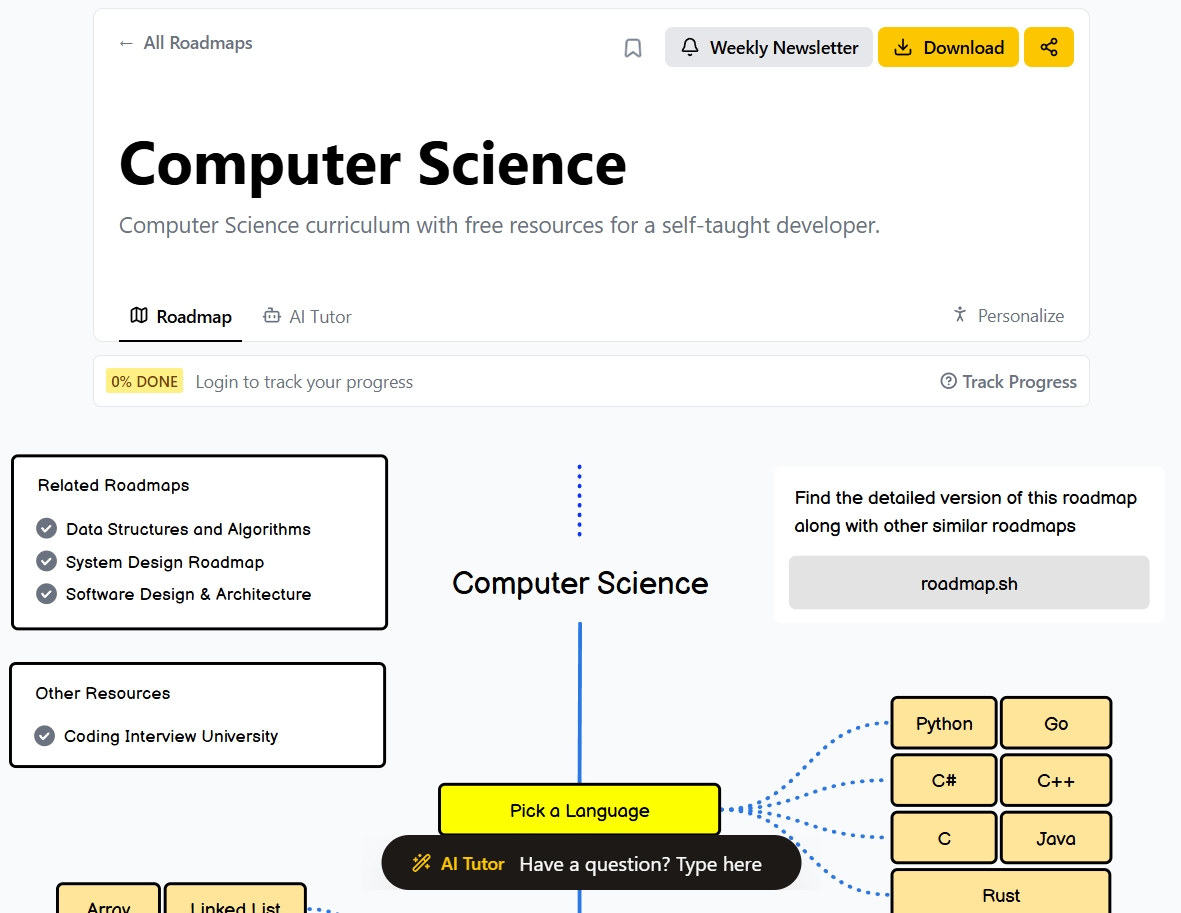 Сайт Roadmap вміщує у собі багато путівників до великої кількості професій та сфер, у яких доволі чітко описано, що саме потрібно для повноцінного вивчення того чи іншого предмету зацікавленості. Замість хаотичного пошуку будь-яких матеріалів, даний сайт пропонує покроковий та структурований план, що стає дуже зручним та ефективним підходом під час освоєння чого нового.