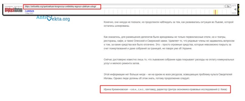 Після закриття ВАЦ у 2017-му Кременовська, за розслідуваннями, запустила нову мережу ресурсів: Центр економіко-правових досліджень (ЦЕПД) з сайтом el-research.center, бюлетень “ГОВОРИ!” (vilneslovo.com), де вона була головним редактором, та портал Antisekta.org. Ці проєкти, зареєстровані з 2017 року, систематично дублювали риторику РАЦИРС: від “чорних списків сект” до закликів посилити контроль над релігійними організаціями. На vilneslovo.com до 2023-го Кременовська координувала контент, включаючи анонси “спільних проєктів” з Antisekta, де партнерами фігурували Олександр Дворкін та його центр iriney.ru.