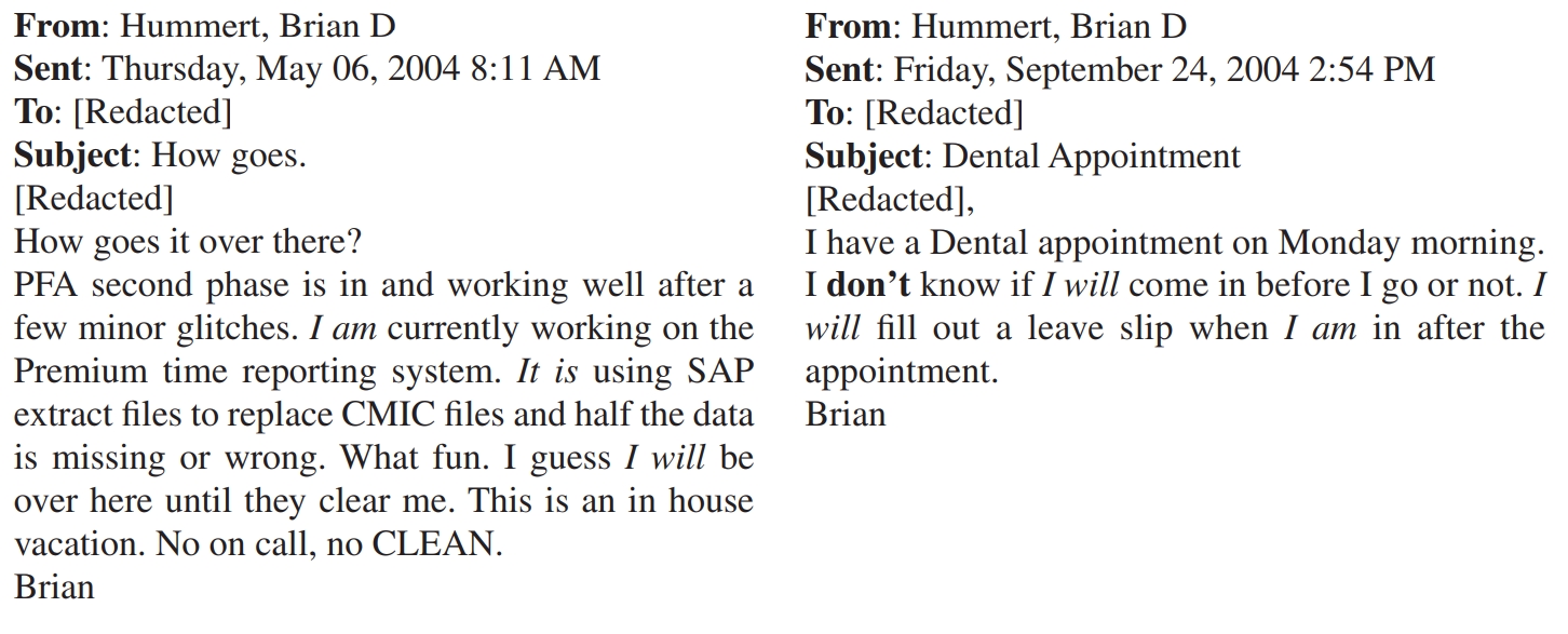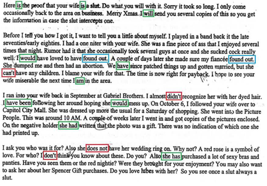 Однак Леонарду було зарано розслаблятися, залишалося ще зв'язати ті два листи з Гаммертом, аби підозрюваний перетворився на засудженого. На щастя, після отримання ордера до рук мовознавця потрапили вже сотні зразків тексту – записки, SMS, листи, імейли тощо. І тут відкрилося те, на що не чекав навіть такий досвідчений лінгвокриміналіст. Подивіться, будь ласка, уважно на виділені курсивом та напівжирним шрифтом елементи у двох листах із особистого листування Браяна Гаммерта.