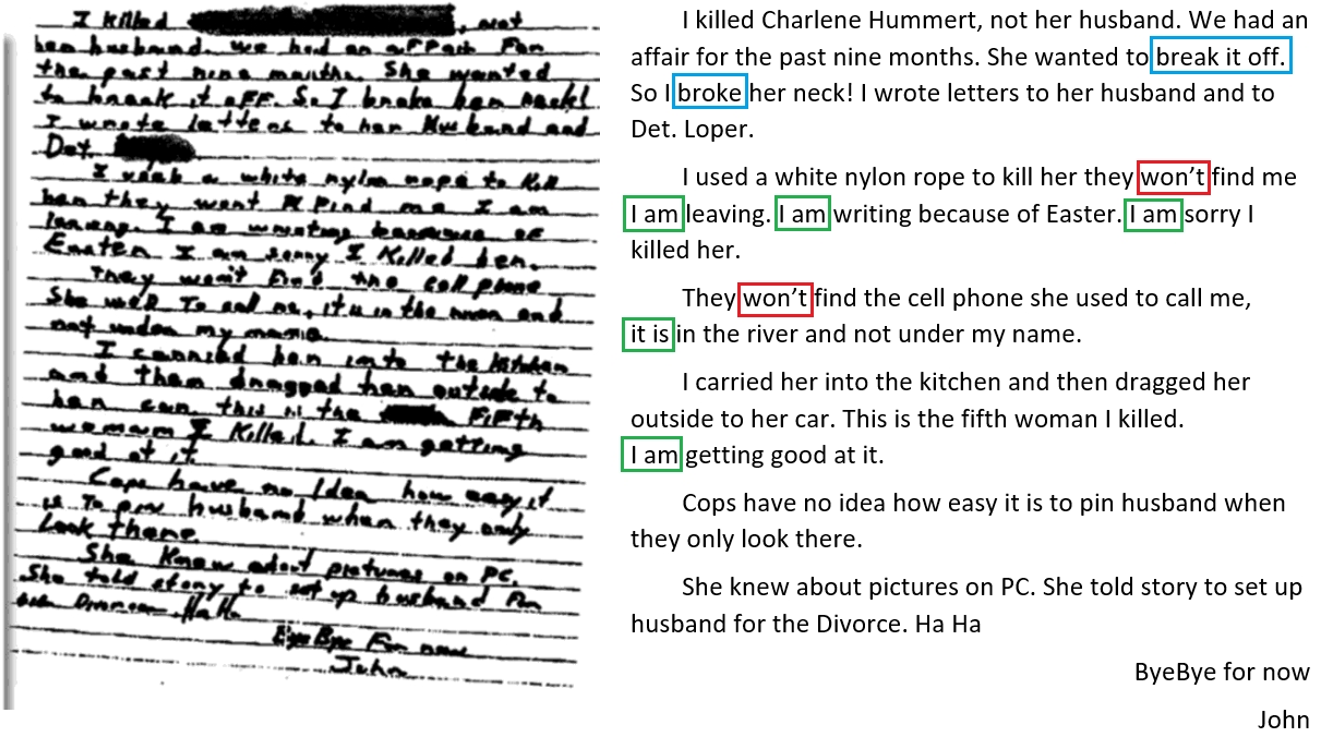 На перший погляд, у листах нічого особливо непересічного не було. Ну так, здавалося, що другий лист – приклад так званого ПОМІКу (POMIC – Post-Offense Manipulation of Investigation Communication, тобто спроба комунікативного маніпулювання слідством після вчинення злочину) – складений навмисне просто, навіть тупувато, але для отримання ордера на обшук цього було недостатньо. Втім, певний цікавий патерн зачепив око лінгвоексперта. У першому листі – це пара "found out – found out", а в другому – "break – broke". Такий літературний прийом називають іронічним повтором (ironic repetition). Це коли ви, наприклад, використовуєте одне й те саме дієслово в реченнях, що йдуть одне за одним, водночас контекст його використання різний, що зазвичай допомагає передати іронію, сарказм або жорсткий гумор. Саме так і вчинив автор. У першому листі він натякає на дещо непристойне, мовляв, хотів і сам дізнатися, на що здатна Шарлін, а в результаті про все дізналася його наречена. У другому ж гумор полягає в тому, що Шарлін хотіла зламати їхні стосунки (break it off), а в результаті зламаною виявилася її шия (broke her neck). Дуже кумедно, обреготатися можна.