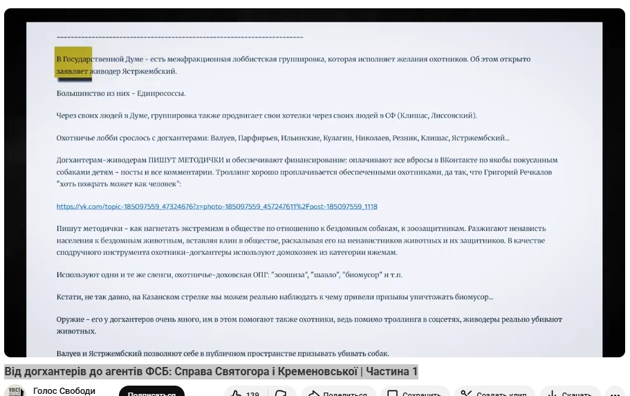 “У державній думі існує міжфракційна лобістська група, яка виконує бажання мисливців. Про це відкрито заявляє живодер Ястржембський. Більшість із них — єдинороси. Через своїх людей у думі це угруповання також просуває свої хотілки через людей у Раді Федерації. Клішас, Лісовський.