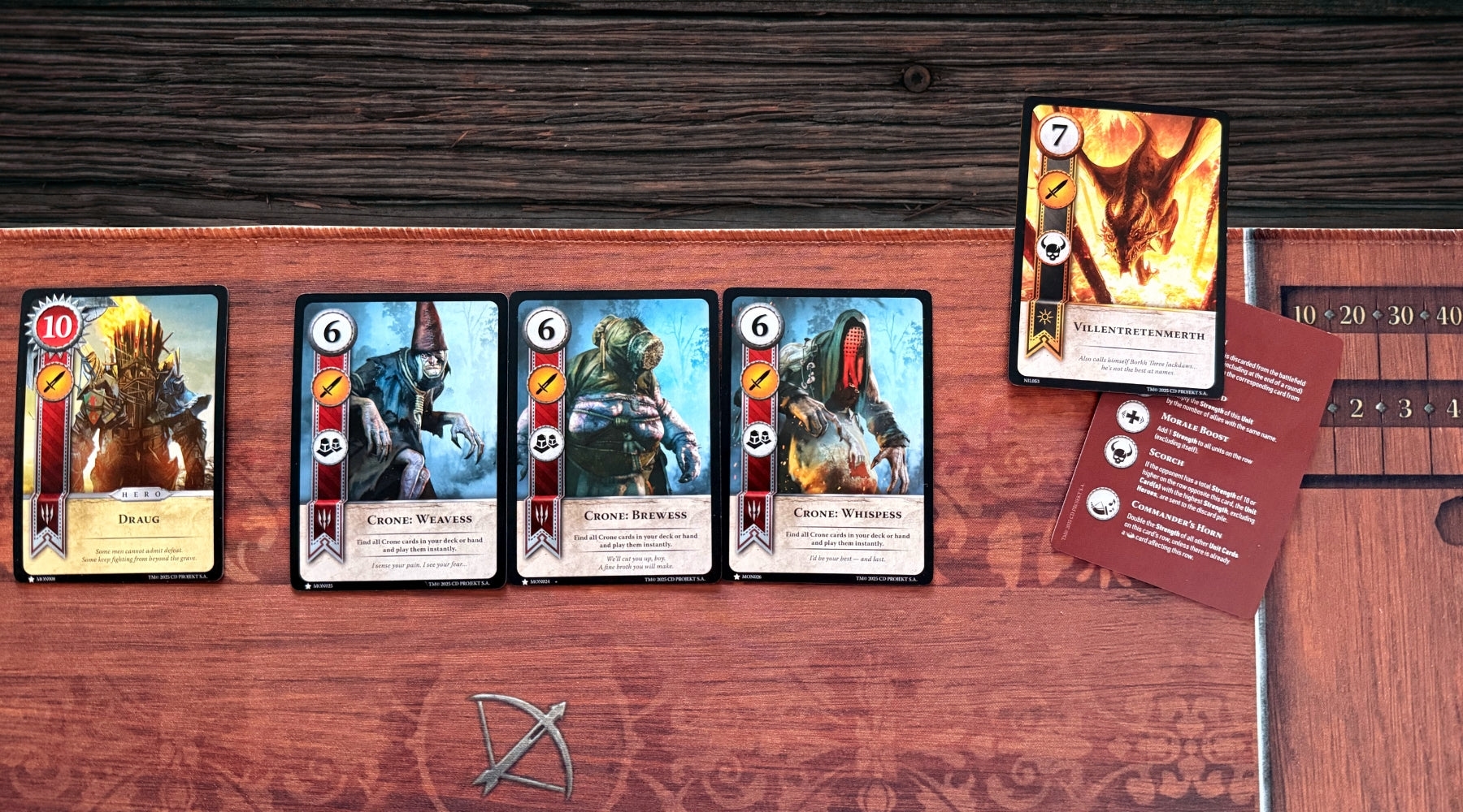 Наприклад, якщо опонент розігрує Віллентрентенмерта, здібність Спалення впливає лише на ваш рукопашний ряд. Оскільки сумарна сила вашого ряду перевищує 10, найсильніша карта загону буде знищена. У цьому випадку, оскільки всі три карти мають однакову силу, всі три Відьми підпалюються та відправляються в стопку скиду.