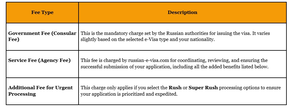 The total cost of your Russia e-Visa is composed of several distinct components, ensuring transparency and flexibility based on your chosen service level.