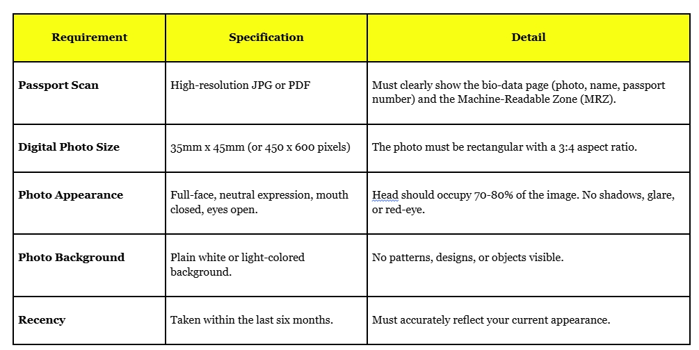 Upload Documents: Upload your digital passport scan and your compliant digital photograph.