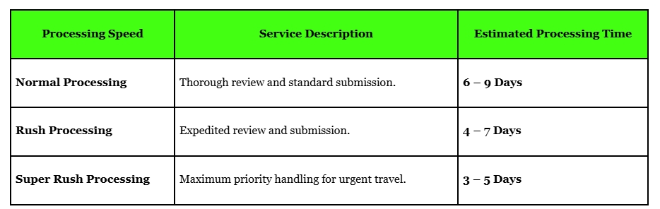 Choosing an expedited option (Rush or Super Rush) ensures your application is handled with the utmost urgency, offering peace of mind when your travel date is rapidly approaching.