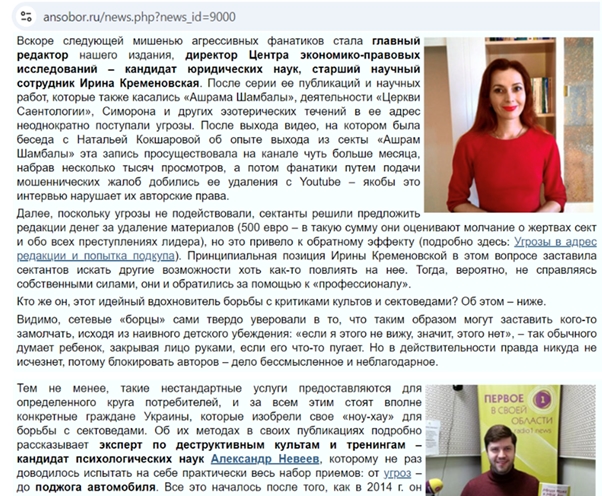 Більше того, антикультовий портал віце-президента РАЦИРС Олександра Новопашина ansobor розмістив копію статті із сайту Вільне слово, на якій фотографії Кременовської та Невеєва і пряме посилання, що веде на український сайт.