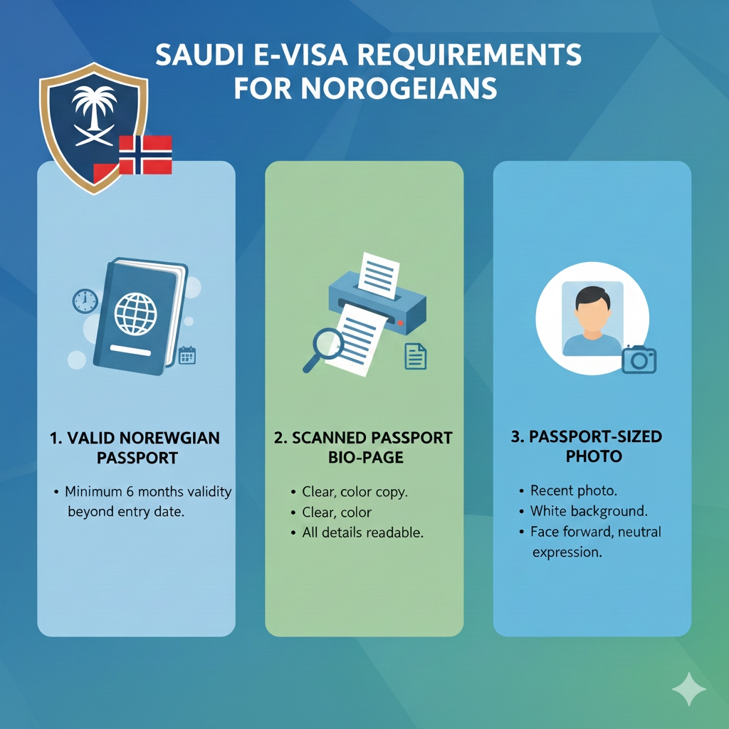 To successfully apply for the Saudi eVisa as a Norwegian citizen, you must meet the following requirements: