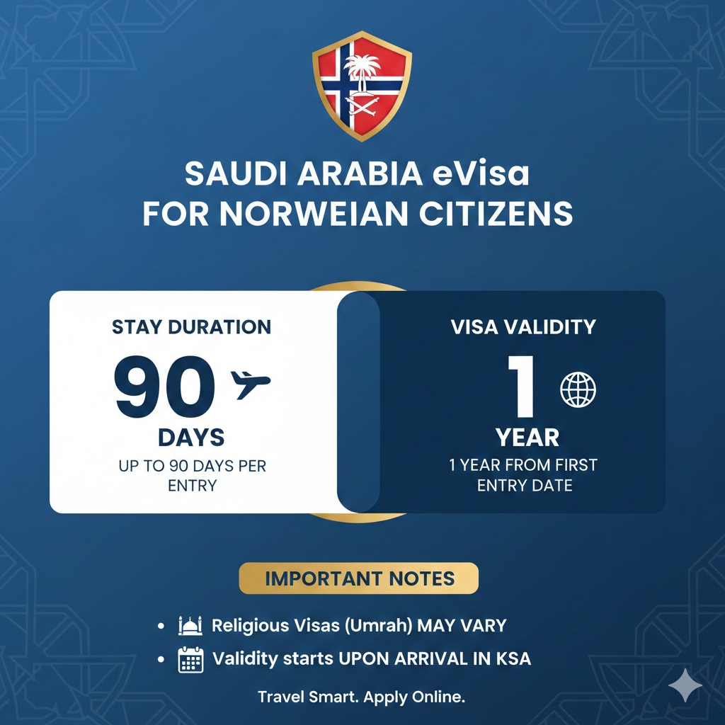 Yes! Norwegian citizens can easily apply for a Saudi Arabia visa online through the Saudi eVisa system. The eVisa process is simple, fast, and convenient. This digital visa allows Norwegian passport holders to visit Saudi Arabia for tourism, business, or to perform religious duties, such as Umrah. The best part? You don’t need to visit a consulate or submit physical documents.