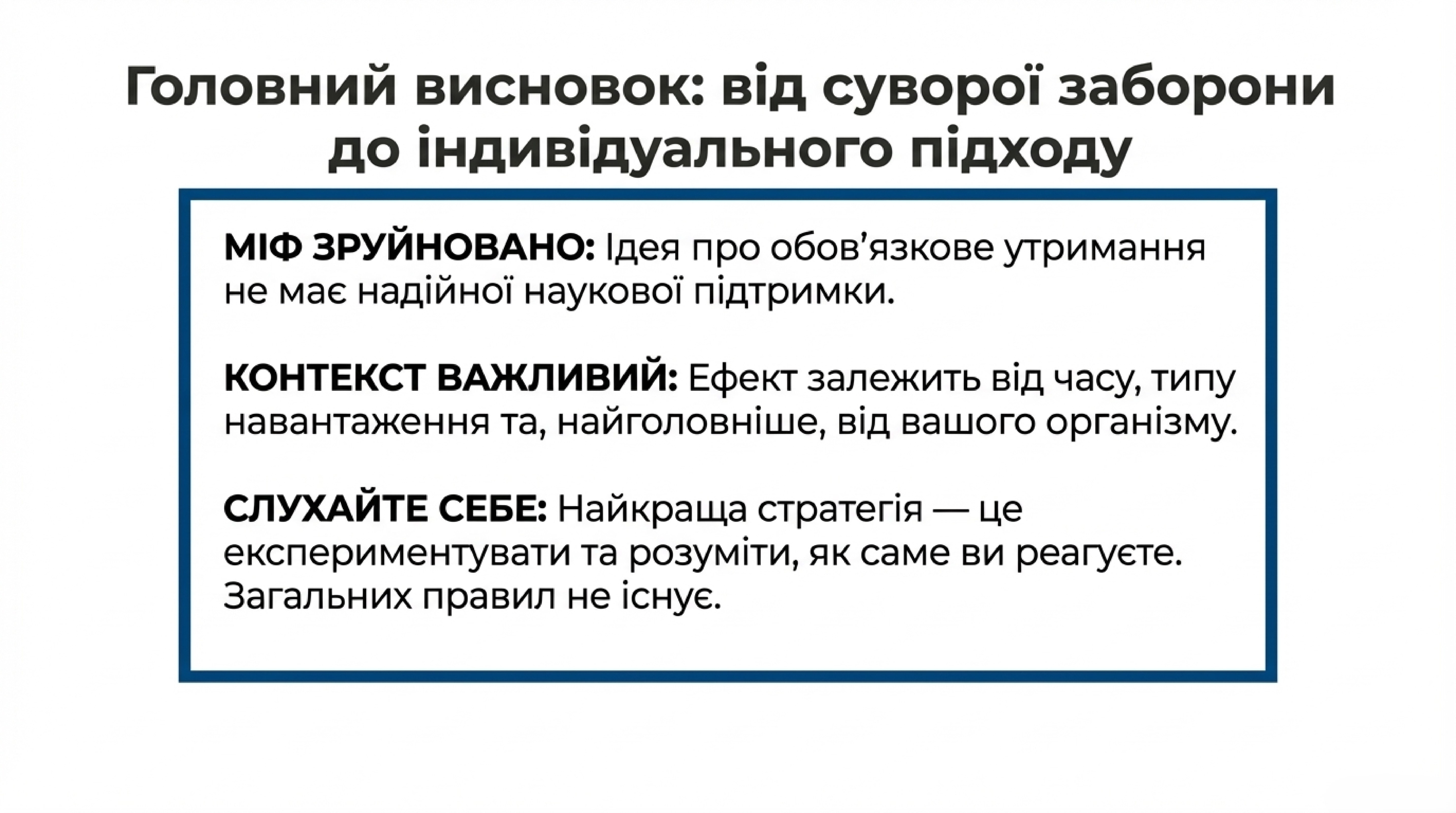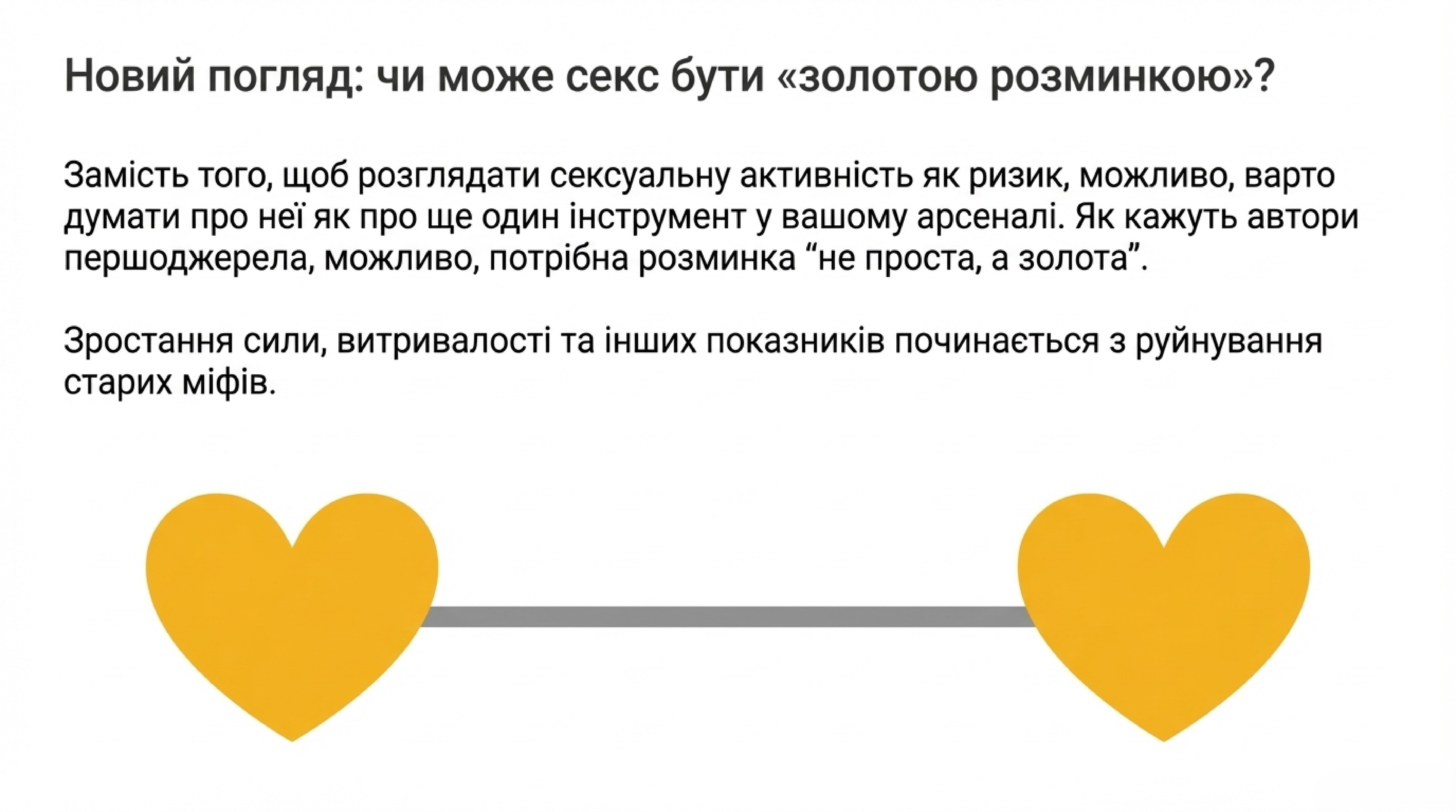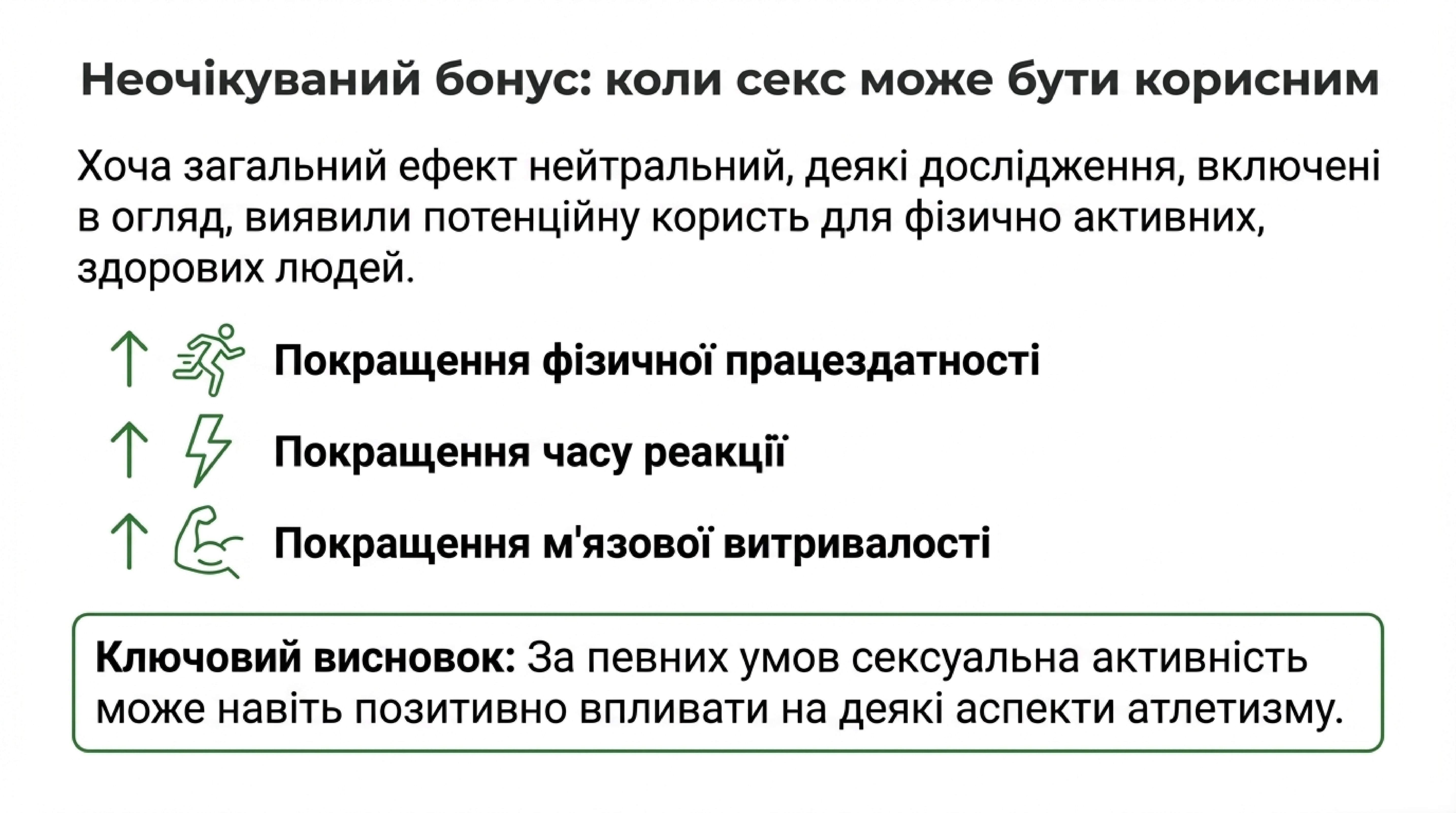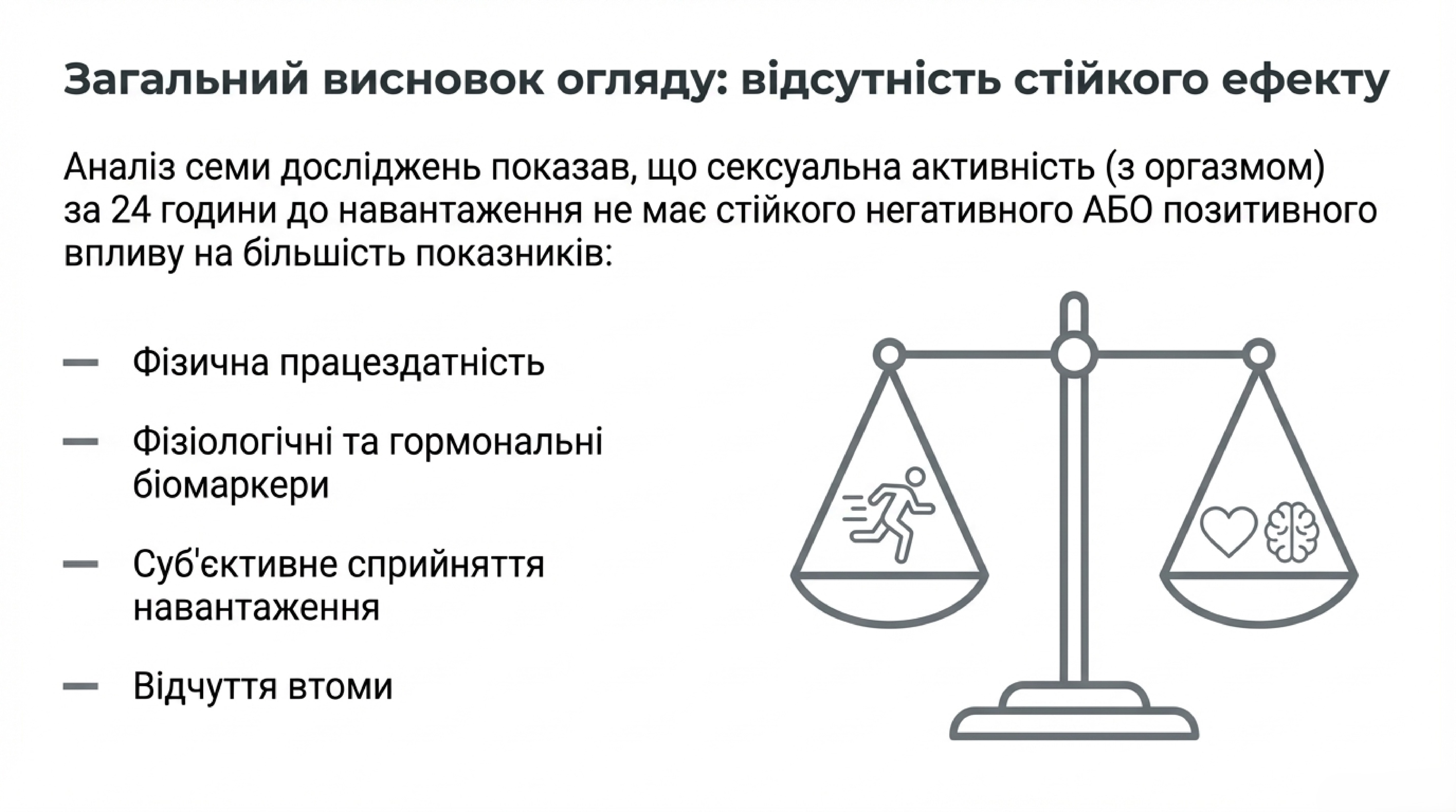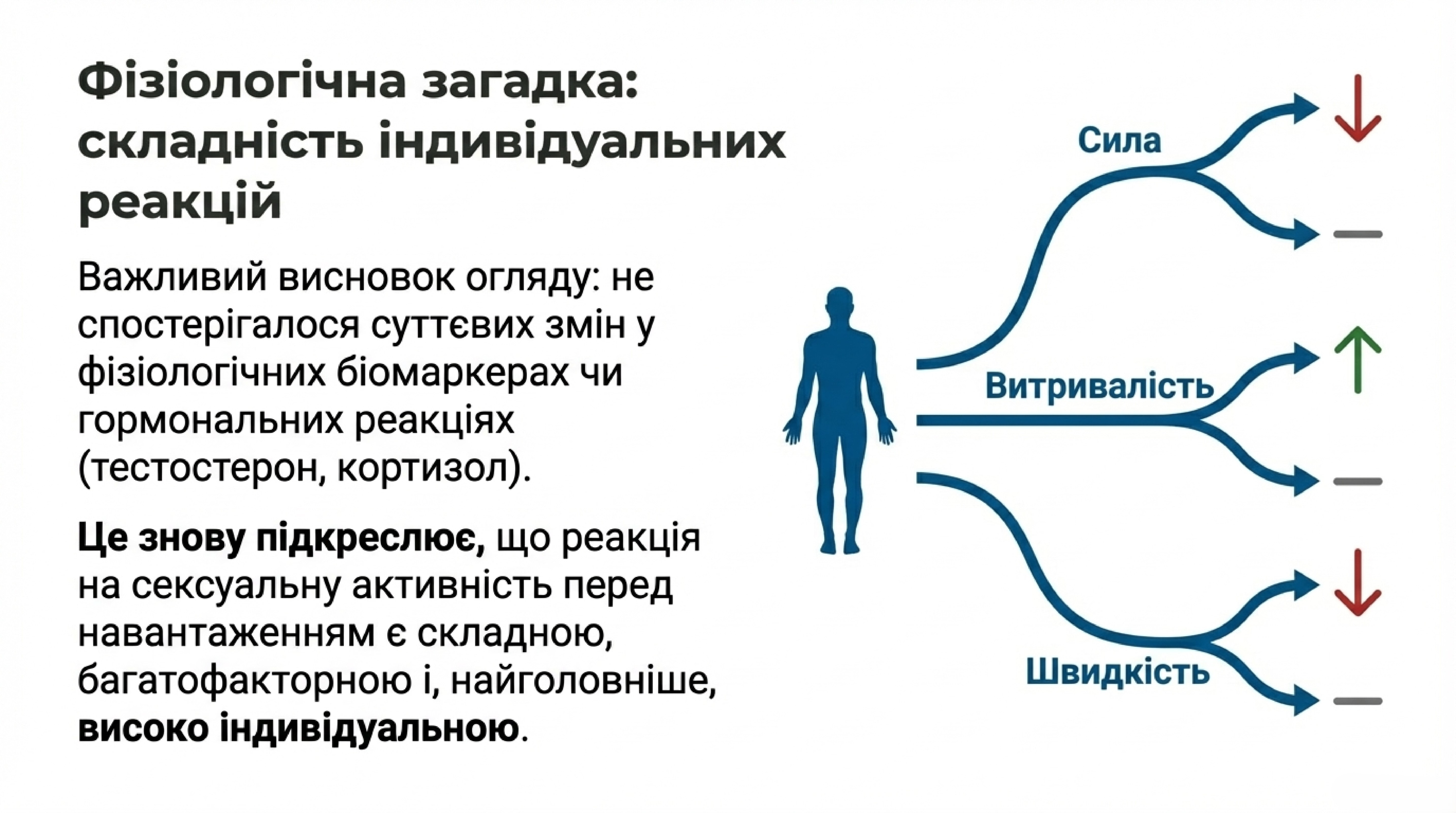 Ця неоднозначність доводить: вплив сексу не є універсальним законом. Це результат взаємодії індивідуальної фізіології, психологічного стану та специфіки вправ.