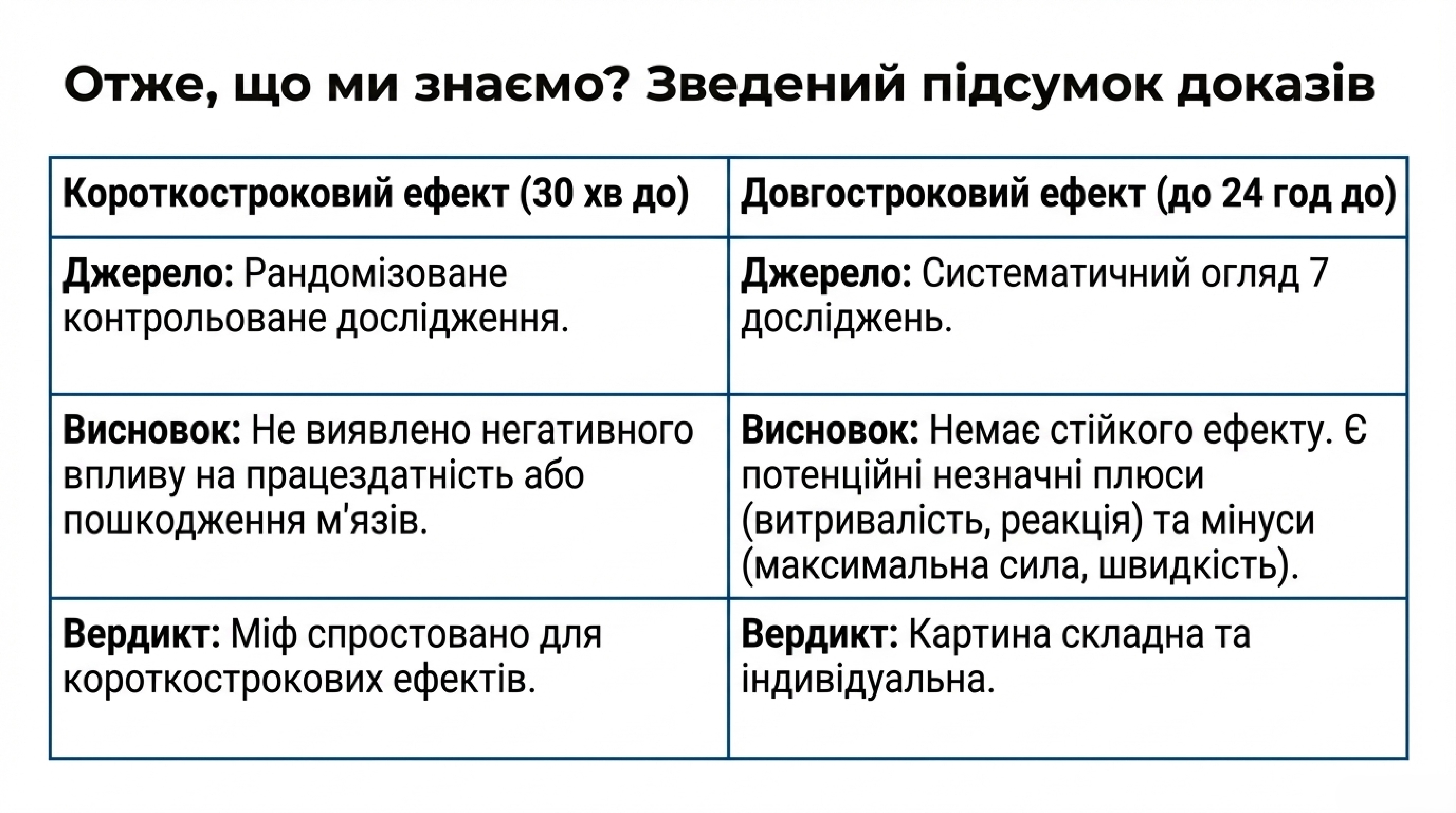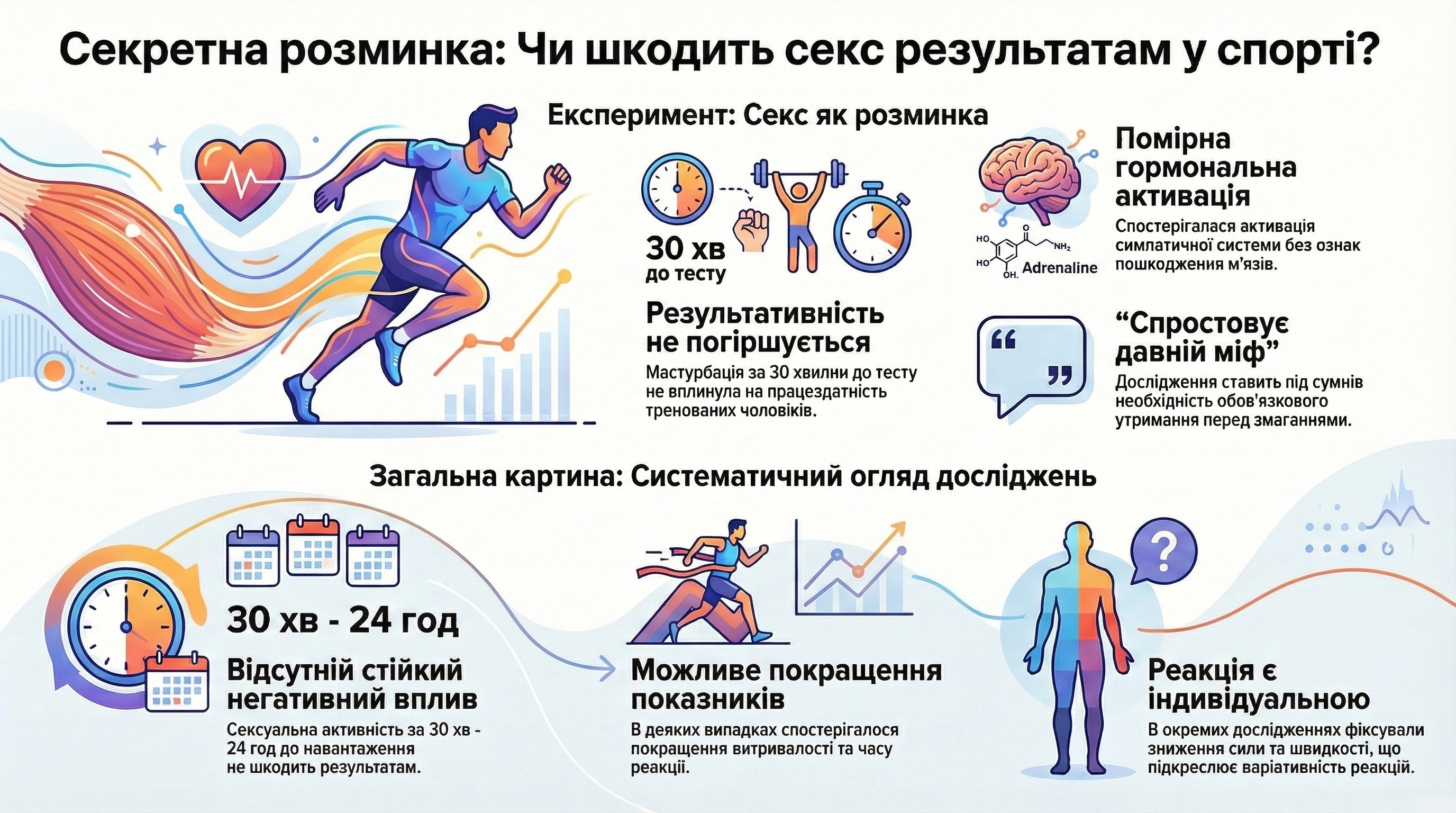 Це вказує на ефект «ноцебо»: якщо атлет вірить, що секс йому зашкодить, він підсвідомо сприйматиме навантаження як важче, навіть за умови ідеальної фізичної готовності. Отже, успіх залежить не лише від стану м’язів, а й від переконань.