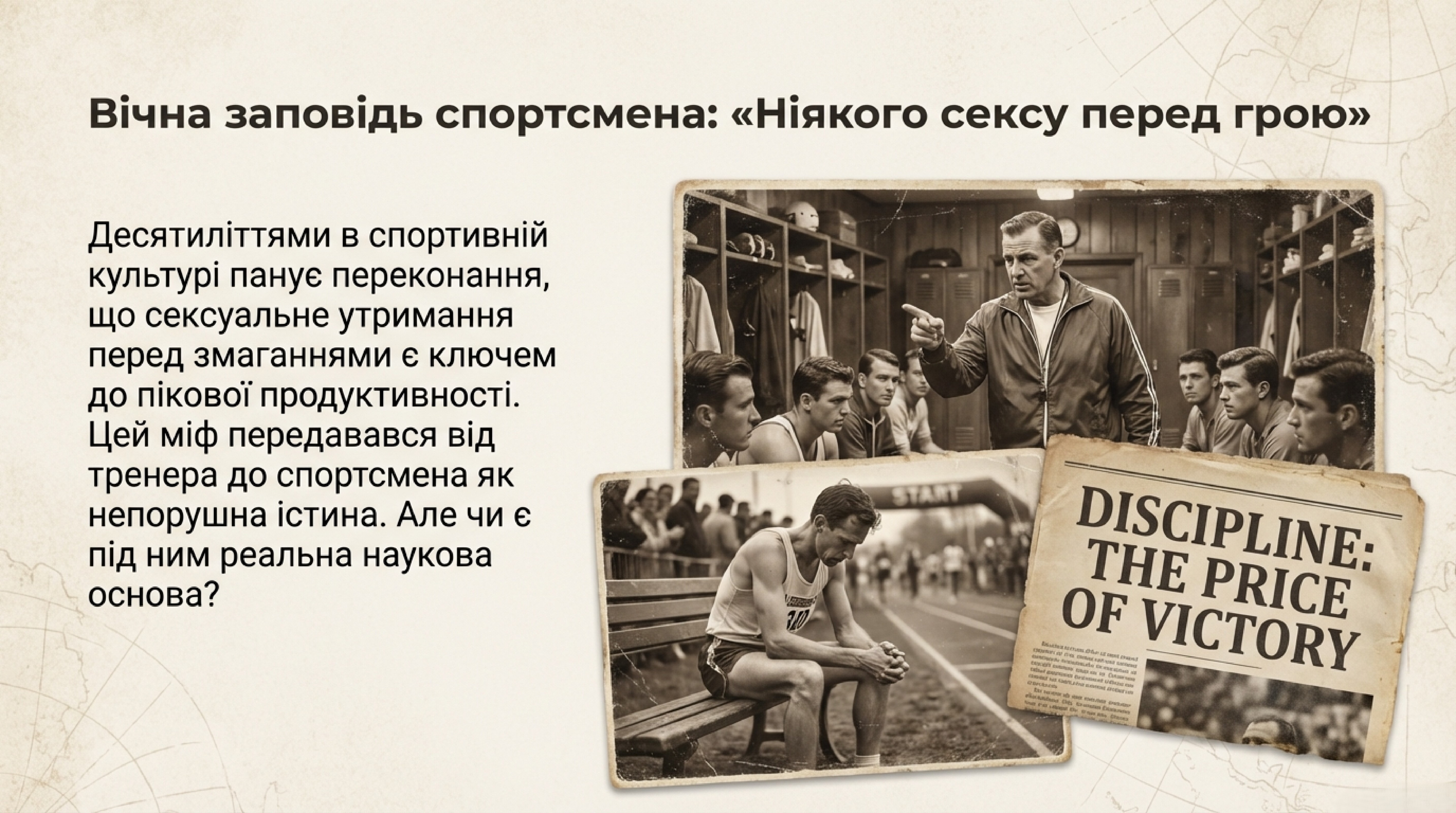 Упродовж десятиліть у світі спорту панував непохитний міф: аби досягти максимальних результатів, атлети мають утримуватися від інтимної близькості напередодні відповідальних змагань. Побутувала думка, що це сприяє ощадженню дорогоцінної енергії, підтримці високого рівня агресії та цілковитому зосередженню на перемозі. Ця ідея настільки глибоко вкоренилася в спортивній культурі, що перетворилася на своєрідну догму для тренерів та їхніх вихованців.