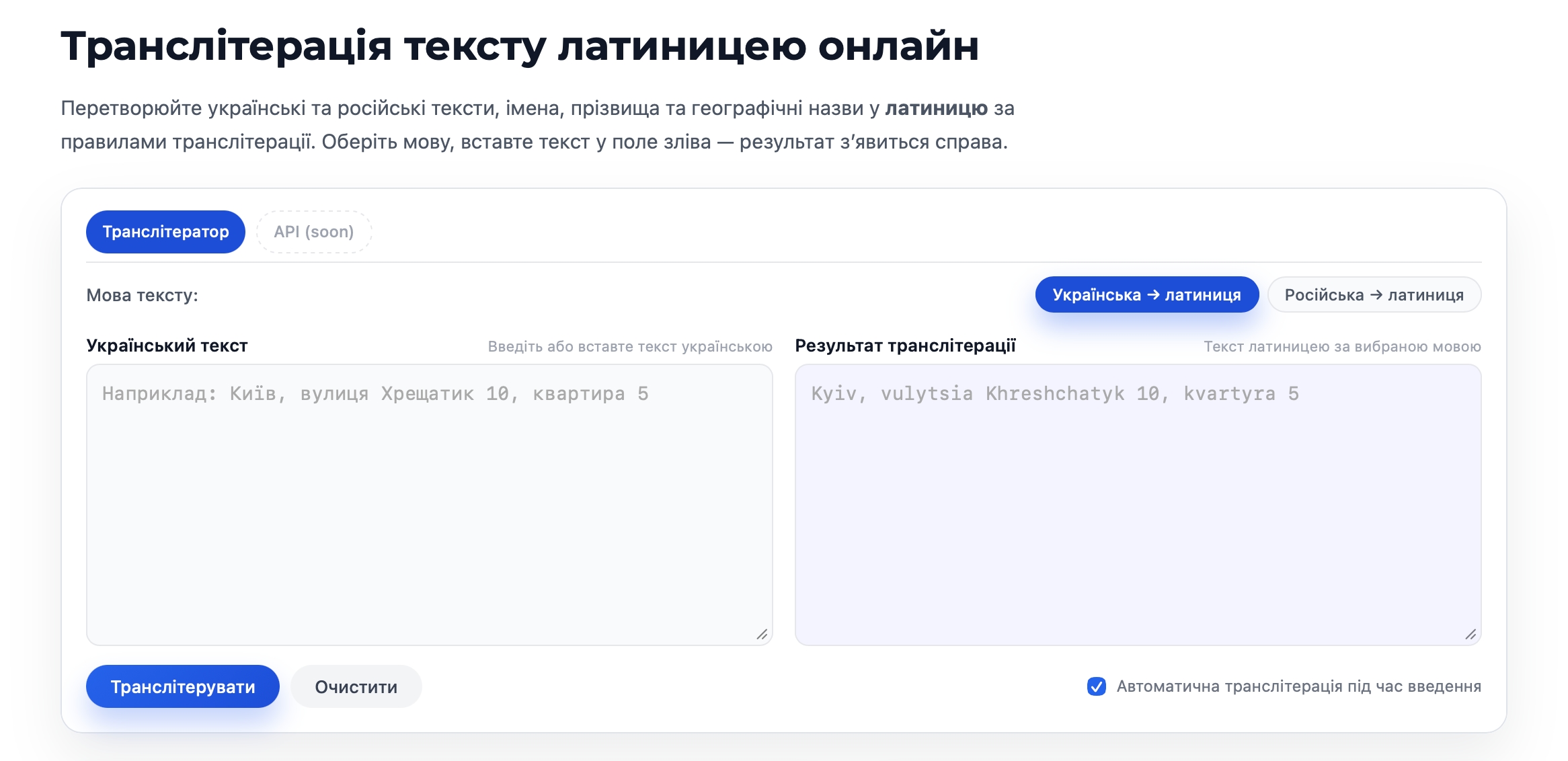 Translit — це професійний онлайн-сервіс для автоматичної транслітерації українського й російського тексту латиницею. Інструмент працює за офіційними правилами та дозволяє миттєво конвертувати імена, прізвища, адреси, назви компаній, географічні об’єкти та будь-які фрази у зручний формат латинського написання. Достатньо вставити текст у поле й натиснути кнопку — система виконає точне перетворення відповідно до обраної мови.