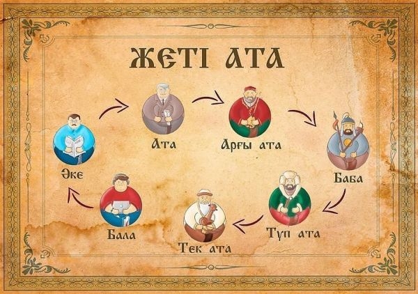 Жеті́ Ата (жети ата). Буквально означає «сім батьків (дідів)». Відображає звичай знати предків щонайменше до сьомого покоління по чоловічій лінії. Казахи вважали обов’язковим повідомляти дітям імена семи предків, щоб уникнути близькородинних шлюбів і підтримати здоров’я роду. У традиційній етиці степу невизнання свого родового коріння прирівнювалося до «сирітства». Казахські прислів’я «Жеті атасын білмеген – жетесіз» і «жігіт, що знає імена своїх предків, шанує свій народ» підкреслюють, що знання «жеті ата» було ознакою зрілості й поваги. На практиці це означало заборону шлюбу між людьми, які мають спільних предків у межах семи поколінь. Таким чином «Жеті Ата» стало ідеалом родинної пам’яті, що зв’язує людину зі спадщиною роду і оберігає спільноту від кровозмішення.