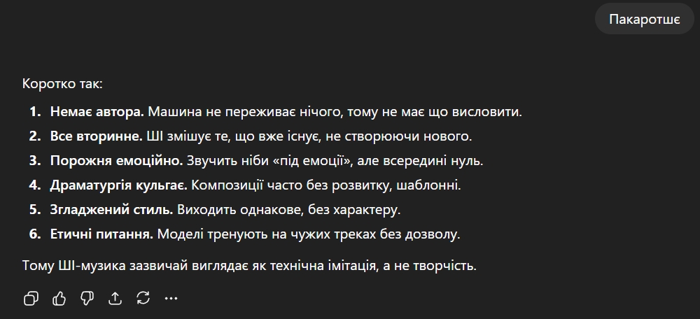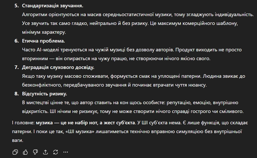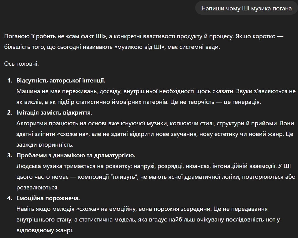Ой, так лінь ото читати. Так і знав, що краще вже самому написати. Ну тоді добре, забуваємо про ChatGPT і слухаємо серйозні аргументи про те, чому ШІ музика погана.