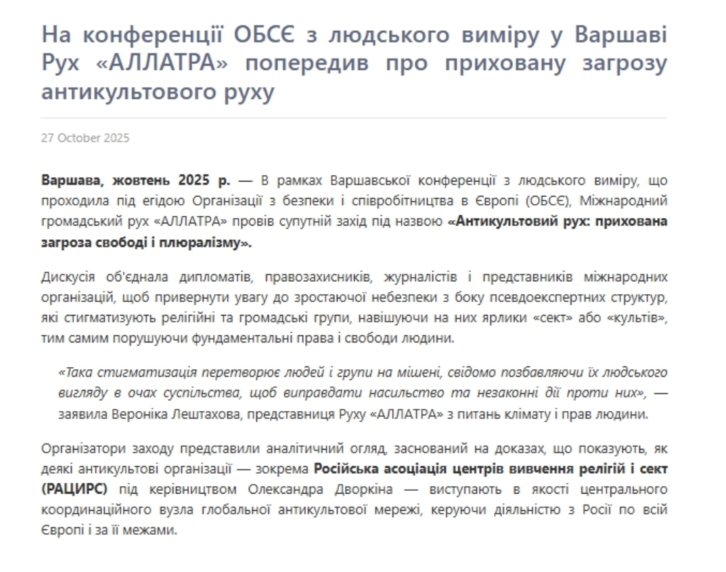 Скрин: Джерело: https://allatra.org/uk/press-release/human-dimension-conference-allatra-warns-hidden-threat
