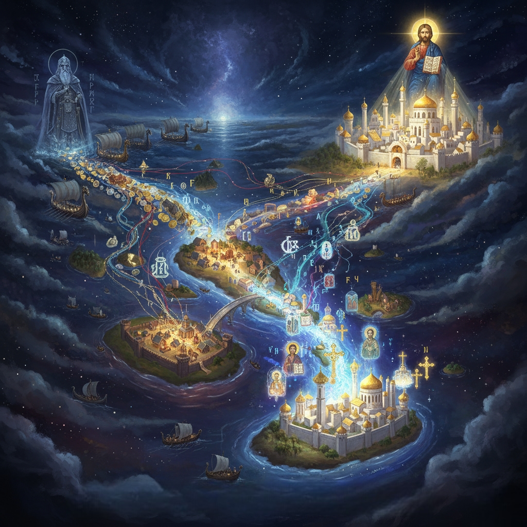 ‘Платон у притчі про печеру описував процес пізнання як вихід з темряви до світла. Християнізація Русі може розглядатися в цій оптиці – як епістемологічний переворот, коли язичницький політеїзм природних сил поступався монотеїстичній картині світу з єдиним трансцендентним началом. Торговельний шлях перетворювався на дорогу метанойї, зміни свідомості. Разом з товарами йшли богословські трактати, літургійні тексти, агіографічні збірки. Візантійська paideia – система виховання та освіти – проникала на північ, формуючи нову антропологію, нове розуміння людини як богоподібної істоти, здатної до морального вдосконалення.