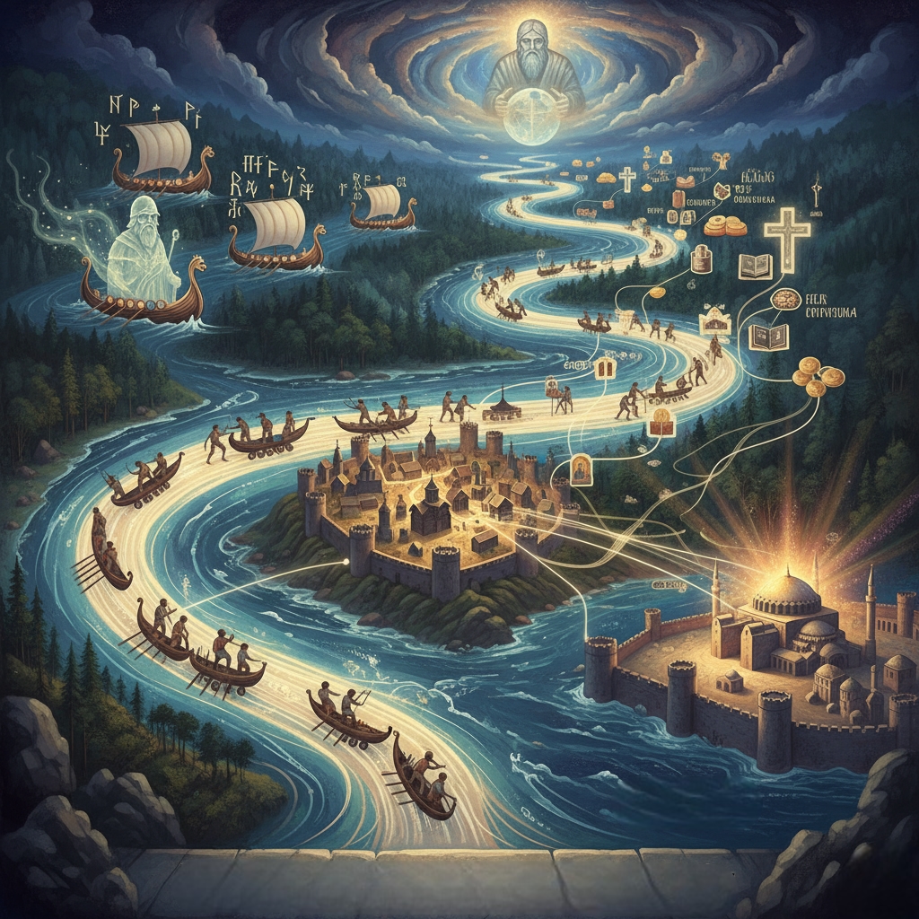 ‘Релігійний чинник поступово набував значення. Християнізація Русі при Володимирі кардинально змінила культурний вектор. Візантійська цивілізаційна модель через церковнослов'янську писемність, літургійну практику, іконографічну традицію проникала в слов'янське середовище, створюючи нову ідентичність. Торговельний шлях трансформувався у культурний коридор, через який йшли книги, ікони, архітектурні зразки, богословські концепції.