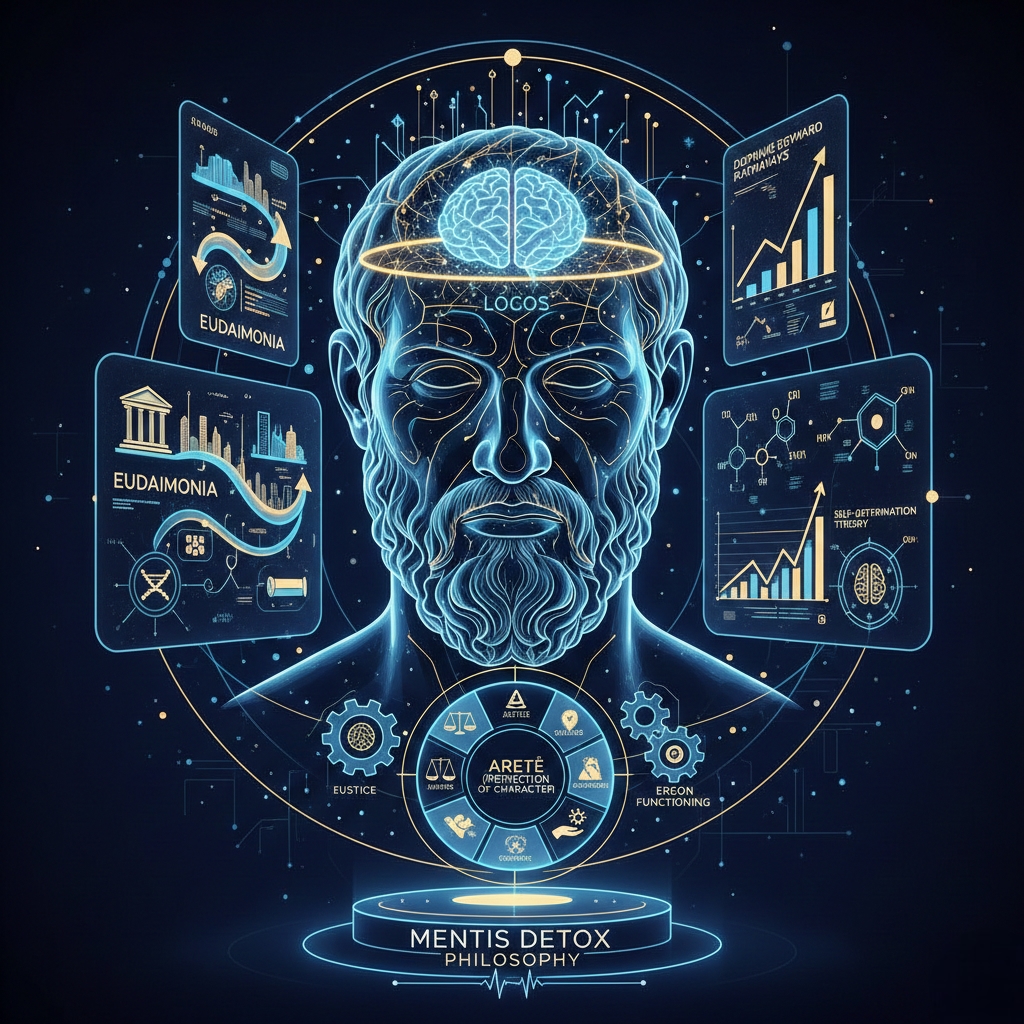 Ці принципи — функціонування через реалізацію потенціалу, практика чеснот як формування нейронних шляхів, свідоме конструювання середовища для підтримки характеру — формують основу моєї Mentis detox Philosophy. Підхід, де античне розуміння еудаімонії зустрічається з сучасною нейробіологією, а мудрість стоїків поєднується з дослідженнями поведінкової архітектури.