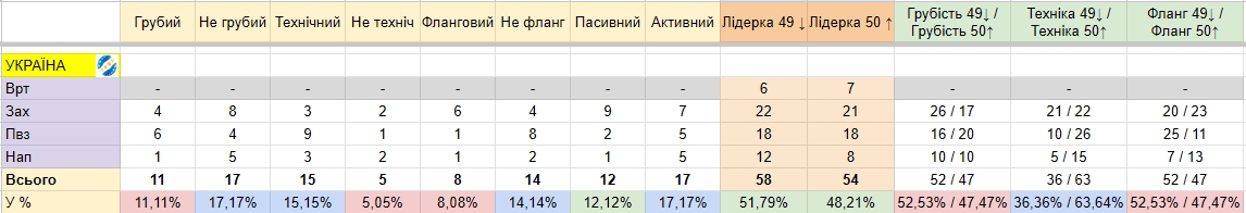 Україна, 99 польових гравці. Відносний баланс лідерства, пасивний стиль в “зеленій” зоні. Найменший відсоток не технічних гравців серед всіх націй. Зате активних і не грубих хоч греблю гати. Найгірше співвідношення “технічних” і “безтехнічних” (63,64% “технічних”). До “зеленої” зони балансу по грубості і флангам не вистачило буквально дещиці.