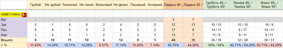Німеччина, 70 польових гравці. Третя нація з дисбалансом по лідерству. Найбільший недобір чистих флангових. Чималий надлишок не флангових. Жодного чистого грубого півзахисника, хоч загальний баланс між “грубими” і “безгрубими” стилями ідеальний.