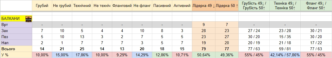 Балкани, 140 польових гравці. Виділяється відсоток чисто технічних - 17,86%, по іншим стилям нічого критичного, хоч “зеленим” є тільки пасивний. Всього 2 флангові півзахисники. Лідерка гарно збалансована.