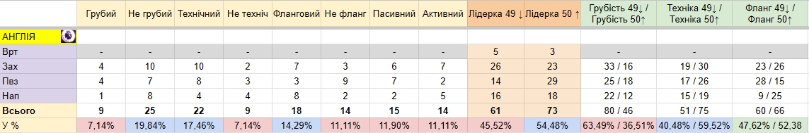 Англія, 126 польових гравці. Є свої плюси і мінуси. З плюсів - непоганий баланс між “фланговими” (не груб, не тех, фланг, актив) і “безфланговими” (груб, техніч, не фланг, пасив) стилями. З мінусів - як і в іспанців нема стилю близького до балансу, хоч пасивний і був близьким до цієї умовної позначки. Крім того, є дисбаланс в лідерстві і найгірше співвідношення між “грубими” і “безгрубими” стилями (аж 63,49% “безгрубості”). Мінусів більше.