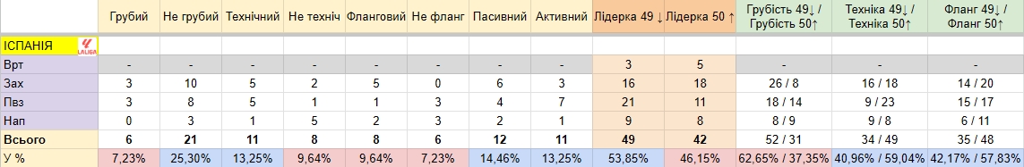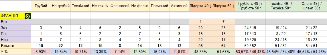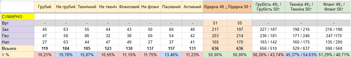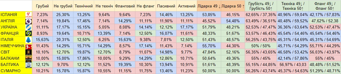 Для початку, хочу уточнити, що я не брав сумарні чи середні показники кожного стата окремо. Було вирішено класифікувати кожного гравця за стилем, який репрезентують його стати (грубий, не фланговий, пасивний і т.п.). Тобто, якщо умовно в гравця грубість-техніка-фланги 60-40-70 - це не технічний гравець, а 27-63-20 це типовий технічний гравець. Значення від 0 до 49 - стиль “негативний”, значення від 50 до 100 - стиль “позитивний”. Ну і лідерство теж захопив, поза увагою залишив тільки стандарти, бо це, на мою думку, зовсім інша тематика. Дані я взяв виключно по гравцях з силою 85-100, за винятком легенд, яких не брав для аналізу. В ФМ все швидко змінюється ледь не щодня, тому уточню, що актуальність статті - станом на 01.04.2026. Тож, підемо по порядку.