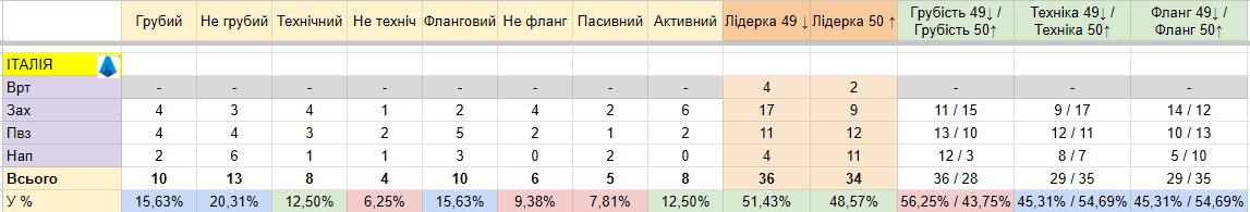 Італія, 64 польових гравці. Активний і технічний стилі - повний баланс. Є великий надлишок не грубих. Нестача пасивних та не флангових. Непоганий баланс лідерства. Незважаючи на надлишок чистих грубих гравців, співвідношення саме в сторону “безгрубих”.