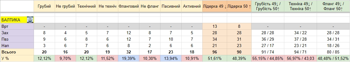 Можна замітити, що є тенденція в нестачі чистих грубих гравців, а також надлишку не грубих і чистих технічних. На загальному фоні в цьому плані вирізняються Італія та Балтика. Трішки менша загальна нестача не технічного стилю.