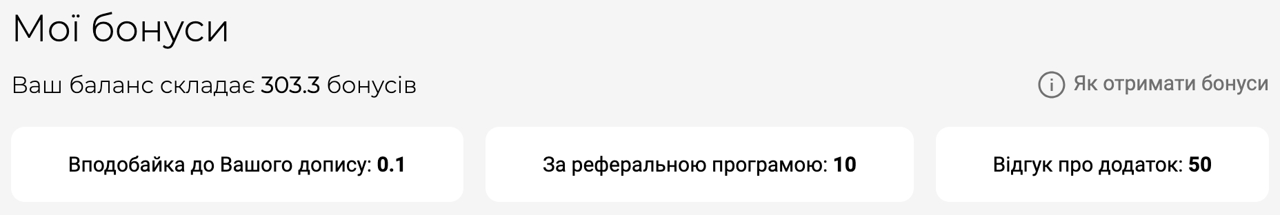 Платформа WE.UA має внутрішню програму лояльності з функціоналом бонусів, які легко накопичити завдяки схвальним відгукам (вподобайкам) до дописів в Профілі, чи в Каналі. Все працює дуже просто: Користувач ставить “серденько”, чи “палець вгору” під дописом іншого Користувача і останній з часом отримує певну кількість бонусів на свій бонусний рахунок. Чим більше охоплення (більша кількість підписників), тим більше винагороди від взаємодії з його дописами може отримати Користувач.