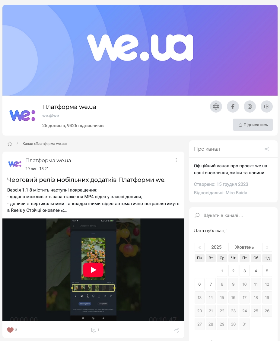 Для тих, хто вже має власні канали в Теlеgrаm, YouTube, чи має сайт з RSS ми пропонуємо ввімкнути автоматичний імпорт публічних повідомлень у власний канал на Платформі WE.UA. Це дасть можливість ретранслювати ваші пости в нашу аудиторію без зайвих зусиль. Доведеться лише підтвердити права на джерело та пройти базову перевірку модератором на якість контенту.