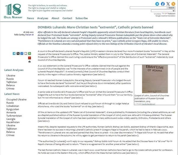«У липні 2022 року чоловіки у військовій формі в Лисичанську, Луганськ, як повідомляється, захопили найбільшу протестантську церкву міста, винесли звідти все майно та перетворили її на будівлю військової адміністрації. Того ж місяця вони захопили ще одну протестантську церкву та, як повідомляється, повідомили членам церкви, що військова адміністрація заборонила баптистів, п’ятидесятників та адвентистів сьомого дня як «екстремістів»».