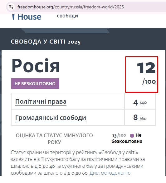 Спираючись на міжнародні індикатори демократії, перш за все Freedom House, станом на 2025 рік, рашка має індекс демократії 12 зі 100, російсько окуповані території