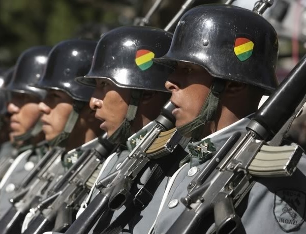 На початку 1941 року Болівія закупила шоломи M1917 у США. 7 квітня 1943 року країна вступила у Другу світову війну на боці союзників, після чого поставки M1917 продовжилися. Наприкінці 1940-х — на початку 1950-х років Болівія зробила значну закупівлю німецьких шоломів Stahlhelm M35, отриманих з різних джерел: частково як воєнні трофеї союзників, а частково — через посередників із Західної Німеччини після 1949 року. Оскільки відновлений німецький уряд мав обмеження на продаж військового спорядження, виробленого за часів нацизму, у контрактах ці шоломи офіційно фігурували під назвою «Polizei-Policia». Болівійські M35 фарбувалися у чорний матовий колір і мали дві бічні декалі: праворуч розташовувався червоно-жовто-зелений національний щит, а ліворуч — знаки розрізнення підрозділів. Національний щит був схожий за формою на триколірний німецький щиток Вермахту. Штальхельм M35 швидко завоював популярність серед б