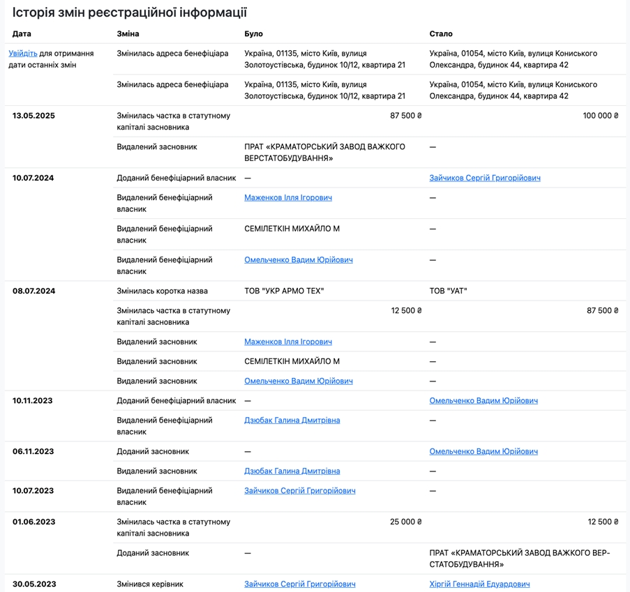 За даними інформаційно-аналітичних платформ, «Укр Армо Тех» було створено у серпні 2022 року, а серед її історичних співзасновників фігурують Михайло Семілеткін, Ілля Маженков, Вадим Омельченко, Сергій Зайчиков та ПрАТ «КЗВВ», кінцевим бенефіціаром якого є екснардеп Максим Єфімов (це підтверджує, наприклад, Opendatabot). До травня 2025-го більшість із них вийшли зі складу засновників, і єдиним власником залишився Зайчиков.