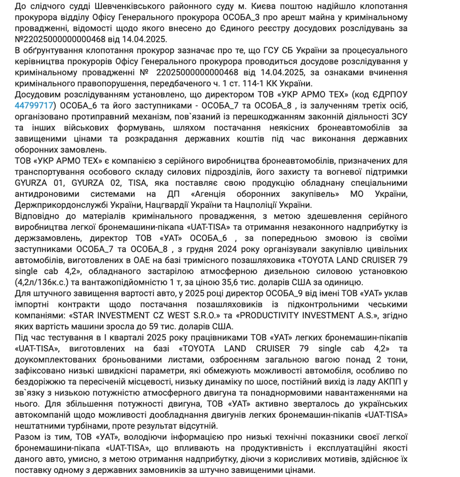 Компанія ТОВ «Укр Армо Тех», яка відома як виробник бронеавтомобілів для українських силових структур, опинилася у полі зору слідчих. За даними оприлюдненої у відкритих джерелах ухвали Шевченківського районного суду м. Києва від 23 вересня 2025 року, підприємство фігурує у кримінальному провадженні №22025000000000468 від 14 квітня 2025 року. Слідство ведеться за ознаками злочину, передбаченого ч.1 ст.114-1 КК України — перешкоджання законній діяльності Збройних Сил України.