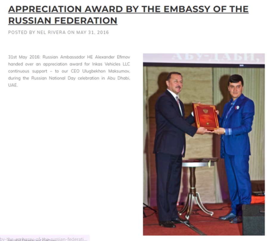 Її власник, Улугбекхон Максумов, відомий своєю проросійською позицією — зокрема, у 2016 році він організовував у Дубаї свято до Дня Перемоги з георгіївськими стрічками та концертами російських виконавців. Компанія Inkas vehicle також була спонсором Національного дня Російської Федерації в Абу-Дабі, а Максумов особисто отримав з рук російського посла в ОАЕ нагороду на знак подяки.